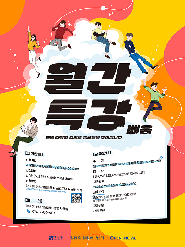 [신청안내] 🟧 신청기간 : 2023년 8월 10일(목) \~ 8월 30일(수) 17:00 🟧 신청방법 : 강남 취•창업허브센터 (http://www.gangnam-jobnstartup.com) > 프로그램 > 신청하기 ※ 자세한 내용은 홈페이지를 통해 확인 바랍니다.