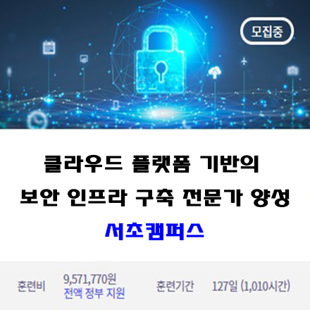[더조은아카데미 - 서초캠퍼스] 훈련과정 - [K-Digital] 클라우드 플랫폼 기반의 보안 인프라 구축 전문가 양성과정 교육일정 - 2023년 10월 11일 \~ 2024년 04월 11일 교육시간 - 09:30 \~ 18:30 (주5일 수업 / 일일 8시간) 교육비용 - 전액국비지원 교육문의 - 02-703-7025 / ocm7607@naver.com