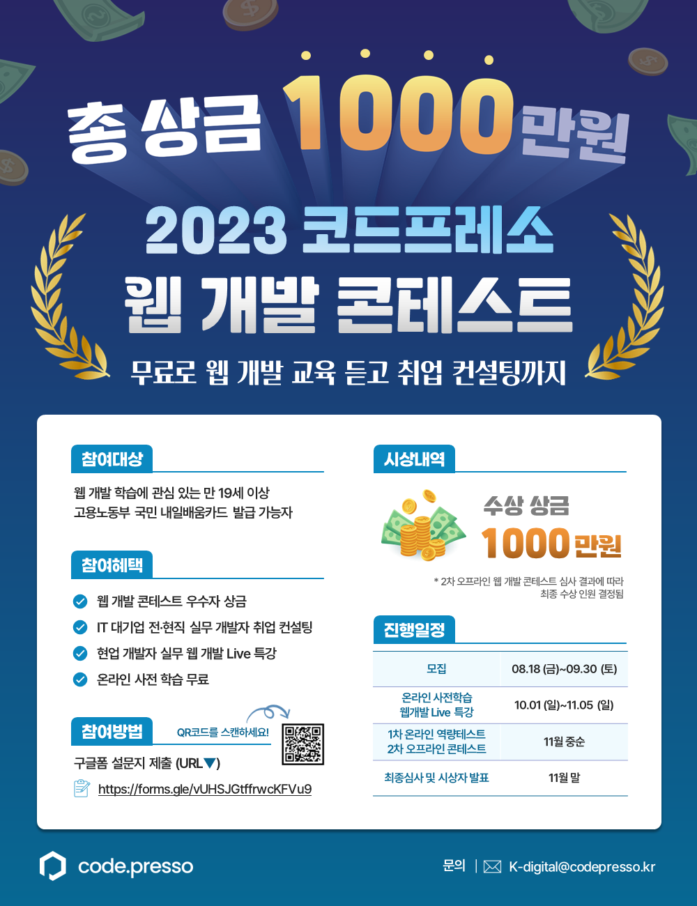 1. 웹 개발 컨테스트 우수자 상금 지급 2. 대기업 전·현직 실무 개발자 취업 컨설팅 3. 온라인 사전 학습 무료 제공 : 웹 개발 기초 이러닝 4. 전·현직 대기업 실무 개발자 웹 개발 Live 강의