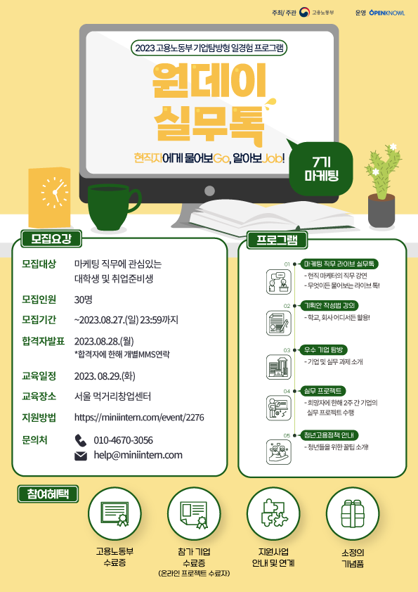 ▷프로그램 내용 1. 마케팅 직무 특강 : 현직자가 들려주는 솔직한 직무 이야기와 취업 TIP! 2. 우수 기업 탐방 : 실무 현장 체험과 현직자와의 Q&A 세션! 3. 실무 프로젝트 : 마케팅 프로젝트 진행하고, 포트폴리오 뚝딱! ▷프로그램 일정 - 모집 마감: \~23.08.27.(일) 23:59까지 - 합격자 발표: 23.08.28.(월) *합격자 대상 개별 연락 - 교육 일정: 2023.08.29.(화)**