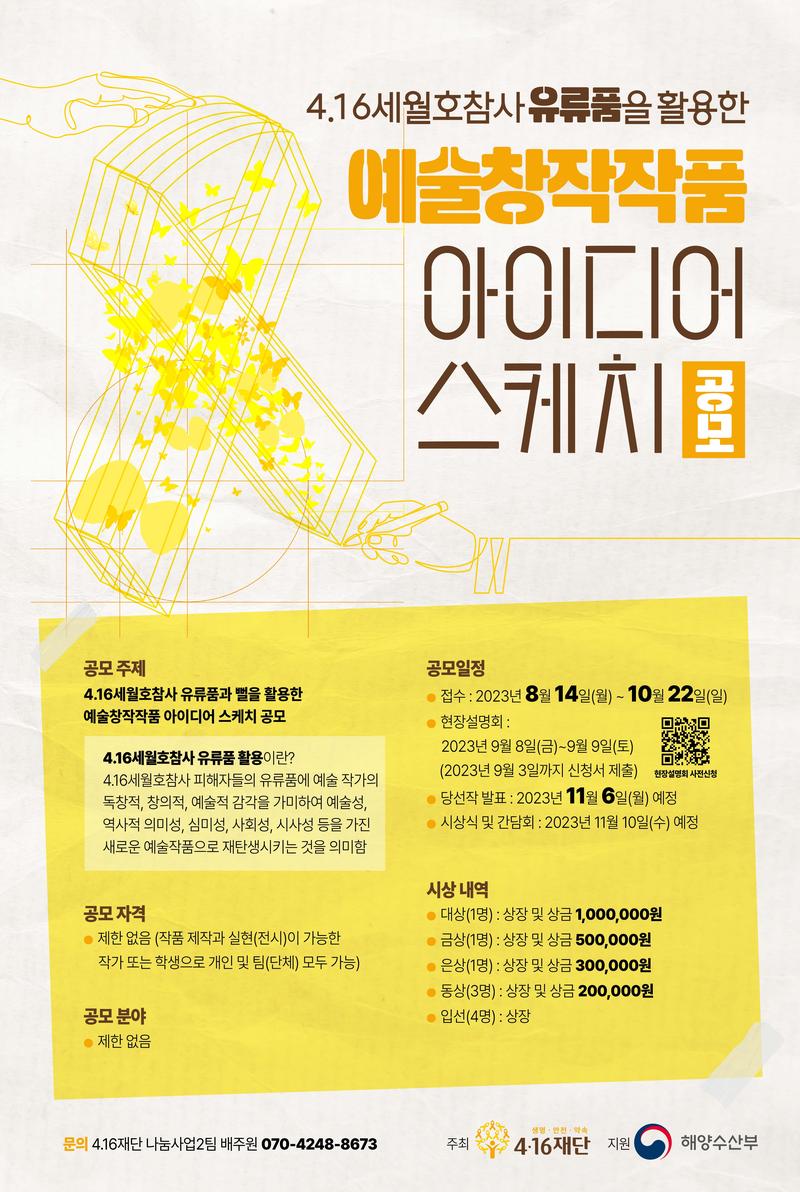<4.16 세월호참사 유류품을 활용한 예술창작작품 아이디어 스케치 공모전>은 세월호참사 피해자들의 유류품을 활용하여 다양한 예술창작작품 아이디어를 통해 2024년 다가오는 "4.16 세월호참사 10주기 특별전시"로 활용하고자 합니다.