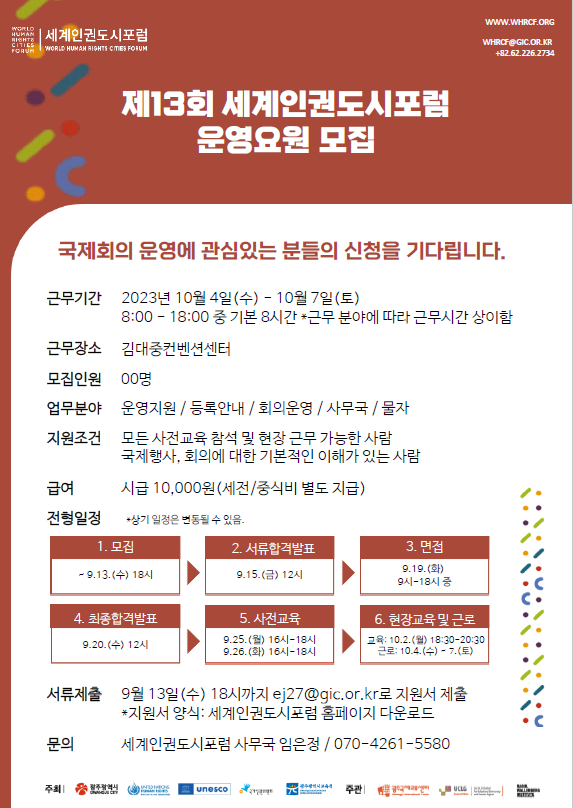 1. 세계인권도시포럼 사무국에서 10월 4일부터 7일까지 진행될 제13회 세계인권도시포럼 운영요원을 모집합니다.