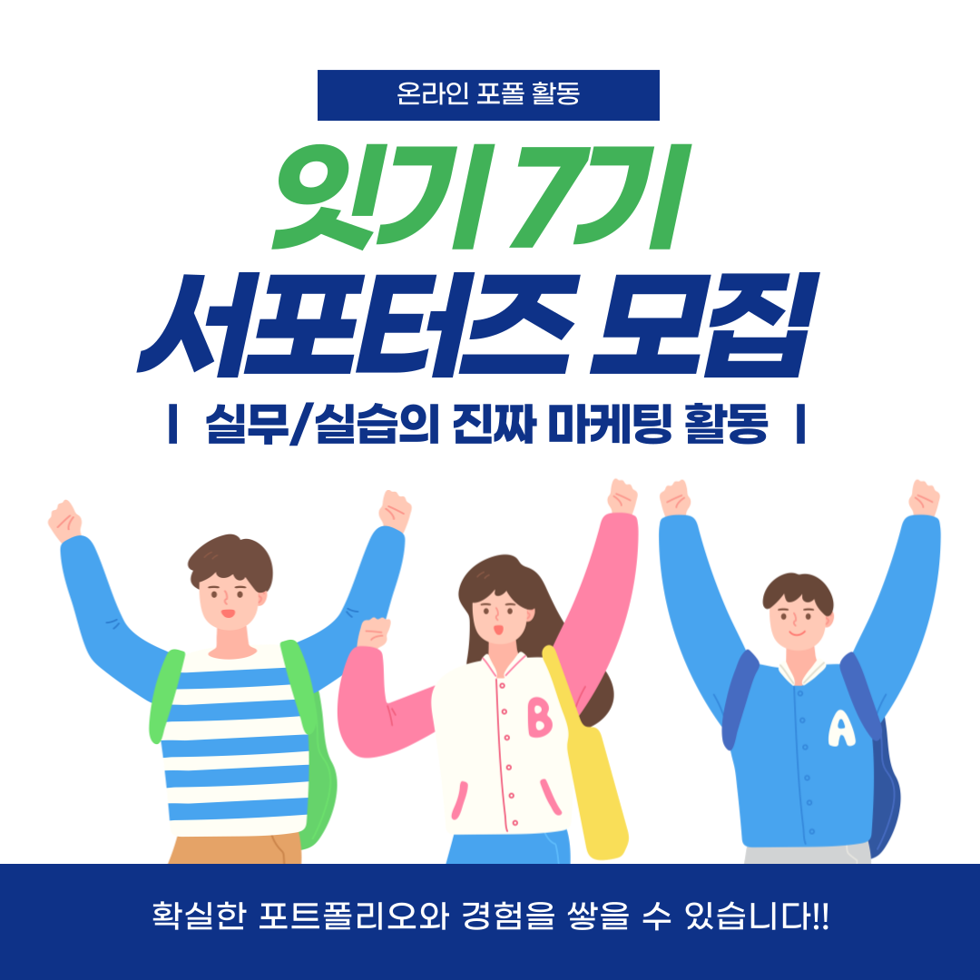 ● 모집 및 활동 일정 1) 모집기간 : 08/31 까지 2) 모집결과 발표일자 : 09/01 오후 4시 3) 오리엔테이션 : 09/02 오전 11:00 4) 활동기간 : 09/02 \~ 10/03 (8주) ● 이런 활동을 합니다 1) SNS채널을 팀별로 한개를 정하여 브랜딩합니다. 2) 마케팅 콘텐츠를 제작하여 게시합니다. 3) 팀원들과 창의적인 회의를 진행합니다. 4) 실무와 유사한 회의 및 KPI로 성과를 측정합니다. ● 잇기 서포터즈만의 특징 1) 여러분들의 의견이 많이 반영되는 활동이 될 것 입니다. 2) 마케팅 실무 멘토링이 함께 진행됩니다. 3) 결과가 좋다면 그에 따른 보상도 이뤄집니다. ● 혜택 1) 서포터즈 활동 수료증 지급 2) 마케팅성과에 따른 성과금 지급 3) 실무와 유사한 시스템 경험 4) 잇기 브랜드 관련 혜택 적용 5) 우수인원 취업추천서 수여 ● 자세히 알아보기 ▶ https://vo.la/1StCY ●문의 카톡 : https://open.kakao.com/me/Creatorsong