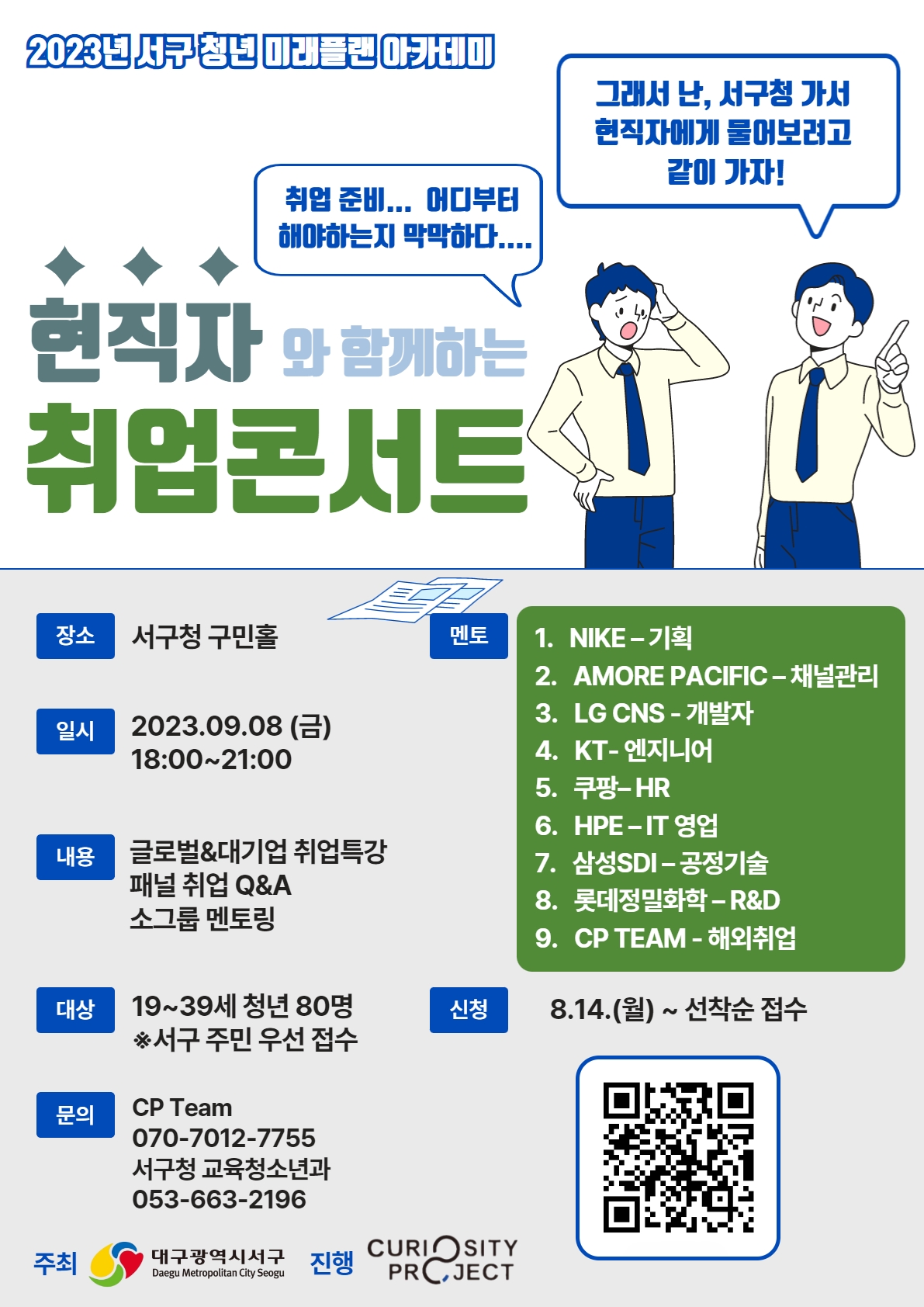 📌 장소: 대구서구청 구민홀 📌 일시: 2023.09.08 (금)18:00-21:00 📌 멘티 : 19\~39세 청년 80명 (※ 서구 주민 우선 접수) 📌 프로그램: - 대기업\, 글로벌 기업 취업 특강 - 패널 취업 Q&A - 소그룹 멘토링 📌 멘토: 대기업, 글로벌 기업 현직 멘토 8명 1. NIKE – 기획 2. AMORE PACIFIC – 채널관리 3. LG CNS - 개발자 4. KT – 엔지니어 5. 쿠팡 – HR 6. HPE – IT 영업 7. 삼성SDI – 공정기술 8. 롯데정밀화학 – R&D 9. CP TEAM – 해외취업 📌 신청 https://docs.google.com/forms/d/e/1FAIpQLSf2mzF242rzQaZKJVBbY2Oi1xmXoWmJh3NtPYxbacvRPgMMiA/viewform 📞 문의 070-7012-7755(CP TEAM) 053-663-2196(교육청소년과)