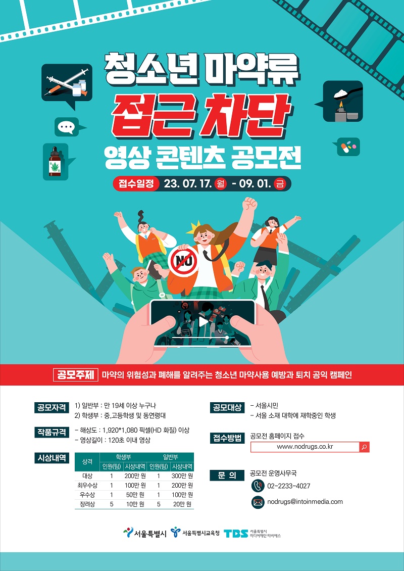 ■ 응모주제 - 마약의 위험성과 폐해를 알려주는 청소년 마약 사용 예방과 퇴치 공익 캠페인 ■ 응모자격 - 서울시민\, 서울 소재 대학에 재학중인 학생 - 1) 일반부 : 만 19세 이상 누구나 - 2) 학생부 : 중\, 고등학생 ■ 응모일정 - 접수기간 : 2023-07-17 \~ 2023-09-01(기간연장) ■ 접수방법 - 공모전 홈페이지 접수 ※ 공모전 홈페이지 주소 : www.nodrugs.co.kr ■ 작품규격 - 1) 해상도 : 1920X1080 픽셀(HD화질) 이상 - 2) 영상길이 : 120초 이내 영상 ■ 시상내역 1) 학생부 - 대상 1명(팀) 200만원 - 최우수상 1명(팀) 100만원 - 우수상 1명(팀) 50만원 - 장려상 5명(팀) 10만원 2) 일반부 - 대상 1명(팀) 300만원 - 최우수상 1명(팀) 200만원 - 우수상 1명(팀) 100만원 - 장려상 5명(팀) 20만원 ■ 문의 - 공모전 홈페이지 Q&A - 공모전 운영사무국 02-2233-4027\, nodrugs@intoinmedia.com