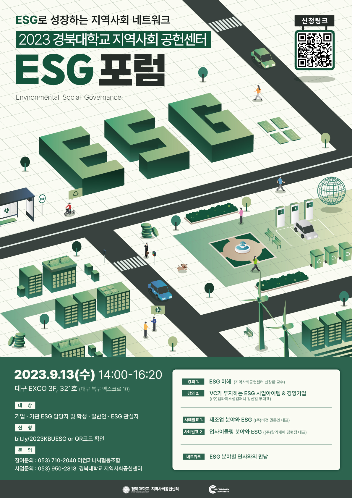 경북대학교 지역사회공헌센터에서 주최하고 더컴퍼니씨협동조합이 주관하는 <2023 경북대학교 지역사회공헌센터 ESG포럼> 1회차 참여자를 모집 합니다! 👏🏻