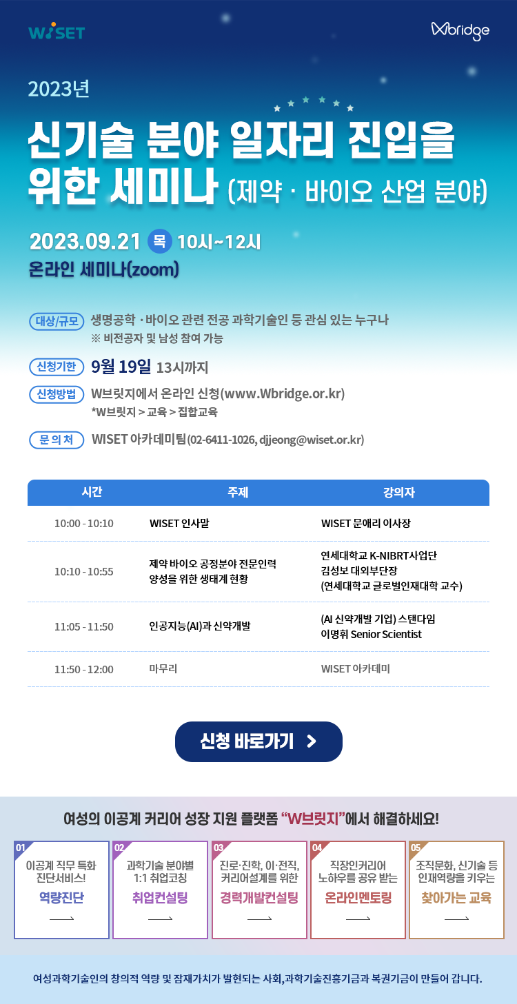한국여성과학기술인육성재단은 바이오 분야 연구에 인공지능, 빅데이터 등이 접목된 첨단 신산업 분야 일자리 정보 제공을 통해 취업에 도움을 주고자 제약 · 바이오 산업 분야 신기술 세미나를 운영하고자 하오니 많은 신청 바랍니다.