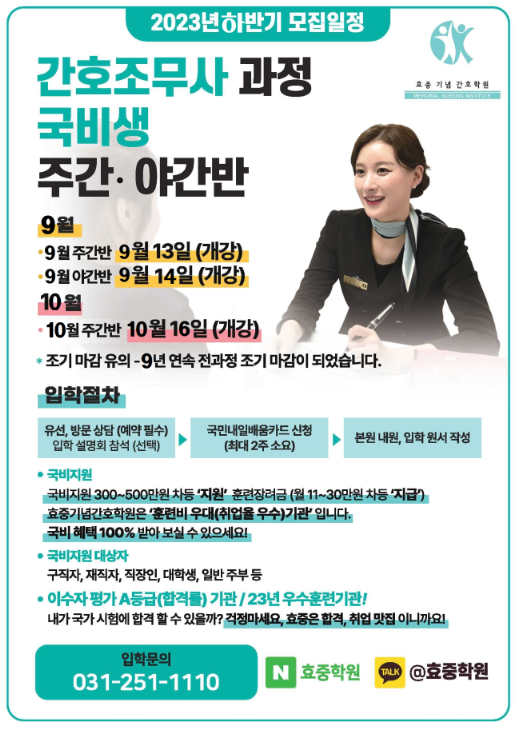 우수훈련기관 효중기념간호학원에서 23년 하반기 수강생을 모집합니다. 내일배움카드을 발급하시면 국비지원 가능합니다. 상반기 과정은 9월(주/야간), 10월(주간) 으로 편성되어 있습니다.