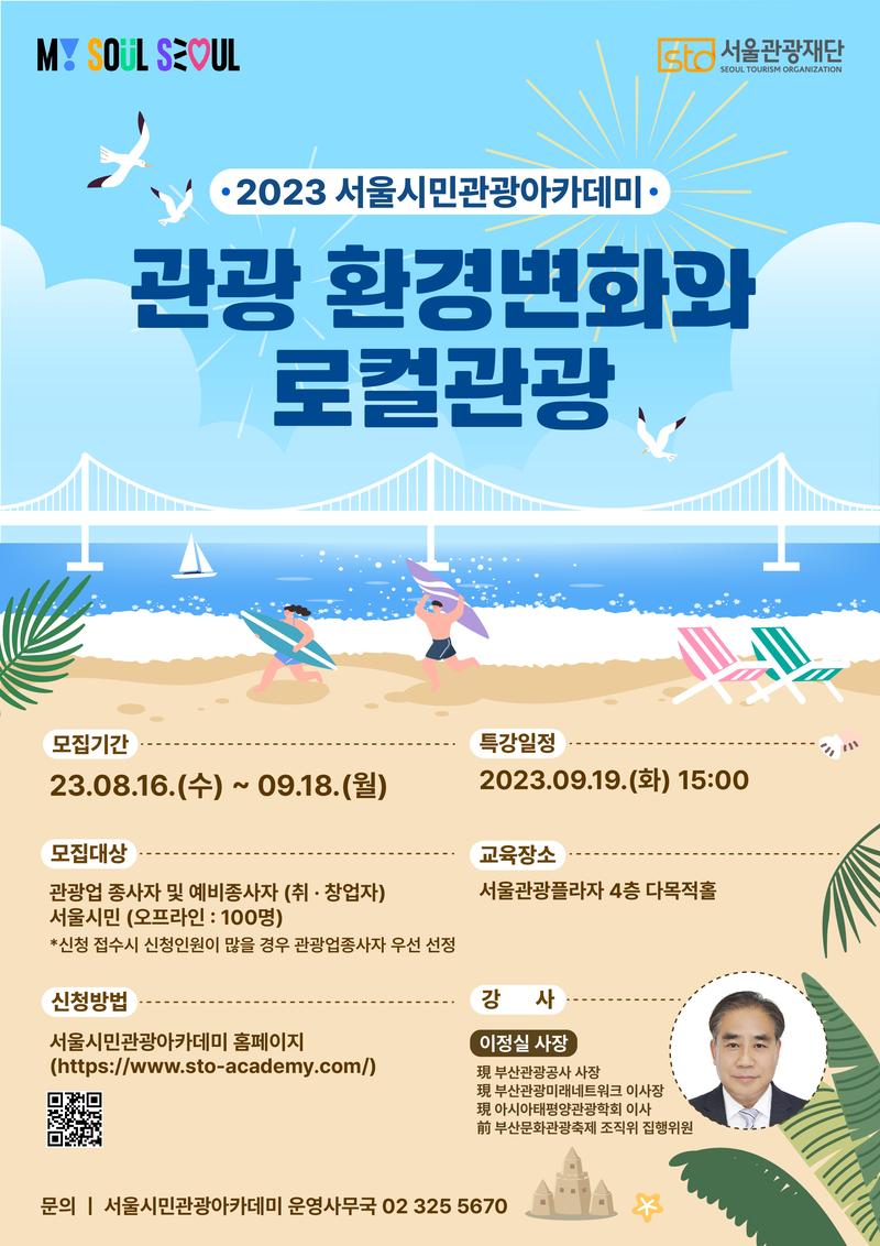 ✅모집기간 : 23.8.22.(화)\~9.18.(월) ✅모집대상 : 관광업 종사자 및 예비종사자 (취/창업자) 오프라인 100명 ✅특강일정 : 23.9.19.(화) 15:00 \~ 17:00 ✅교육장소 : 서울관광플라자 4층 다목적홀 ✅신청방법 : 서울시민관광 아카데미 홈페이지 [https://www.sto-academy.com/]