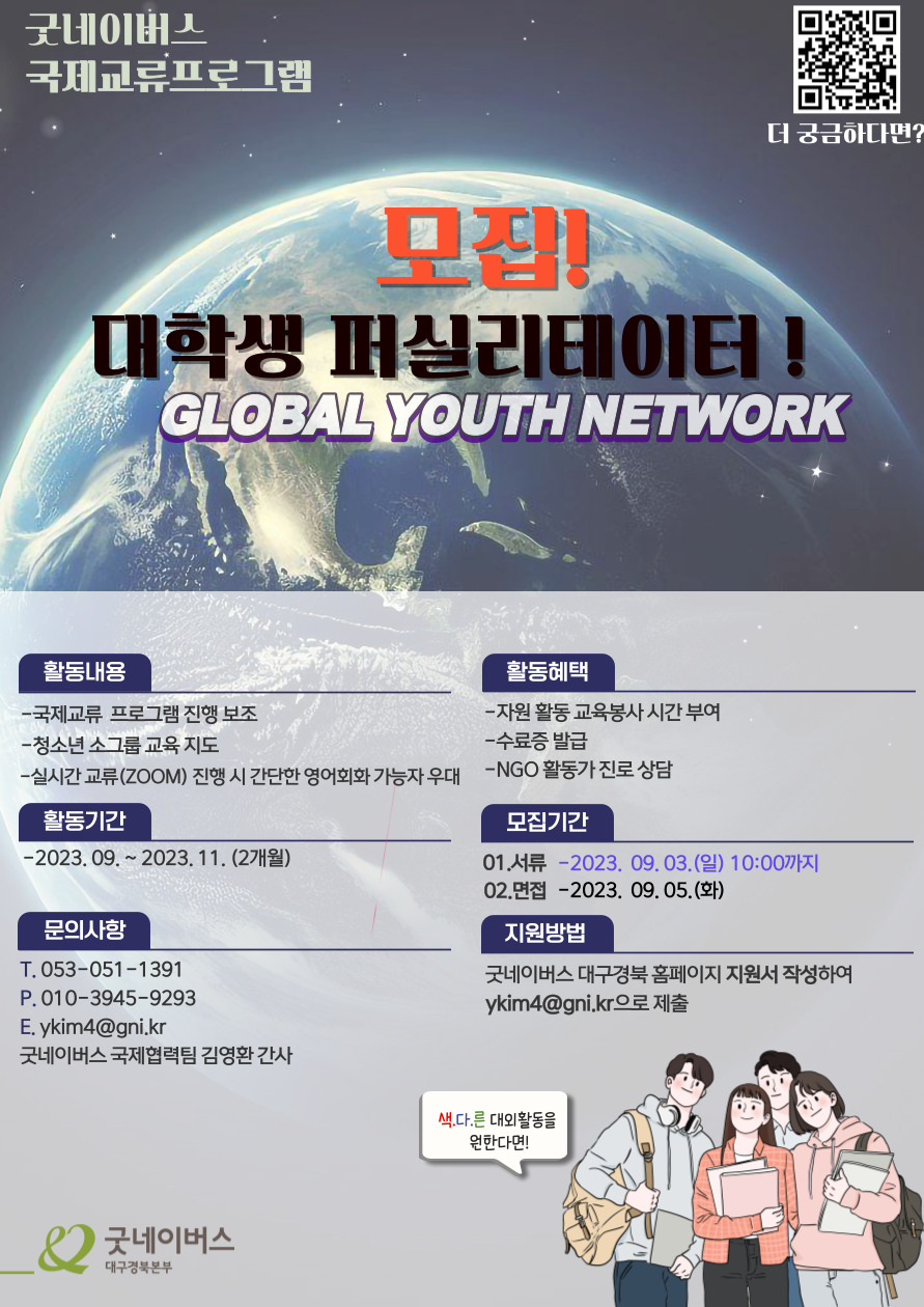 ※ 2023년 언론기사 보도자료 [2023-8-2 잡포스트] 굿네이버스 대구경북본부, 청소년 국제교류 프로그램 ‘글로벌 유스 네트워크’ 4기 성료 https://www.job-post.co.kr/news/articleView.html?idxno=82226 [2023-6-27 대구일보] 굿네이버스 대경본부, 세계시민교육 청소년 국제교류 프로그램 진행 http://www.idaegu.com/newsView/idg20230627005