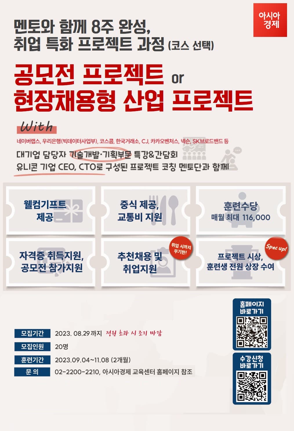 특히 이번 과정은 현직 CEO &CTO 코칭 멘토가 참여해 현장채용, 추천채용을 통해 성공적으로 취업할 수 있도록 확실한 인사이트를 제공합니다. 네이버랩스, 우리은행(빅데이터사업부), 하나은행, 크래프톤, CJ, SK브로드밴드 등 빅테크 기업의 실무자를 초청해 산업동향 및 직무, 인사 채용 특강과 간담회가 진행됩니다.