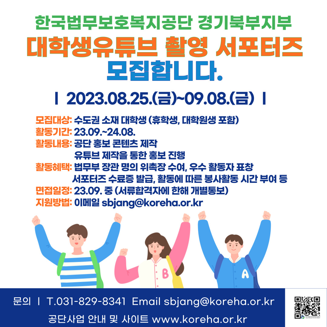 □ 개 요 : 대학생 유튜브 제작 서포터즈 □ 활동내용 : 공단 홍보 콘텐츠 제작 및 홍보 유튜브 제작을 통한 홍보 활동 진행 □ 모집인원 : 총 15명 □ 활동기간 : 2023.09.\~2024.08. (1년 활동이며, 희망자 연임 가능) □ 접수방법 - 이메일: sbjang@koreha.or.kr (지원시 메일 및 첨부파일 제목 통일 ※붙임 1 참고) - 제출서류: 지원서 및 개인정보동의서