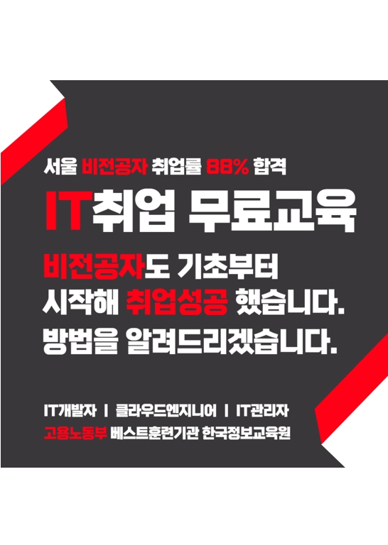 ✔️교육기관 : 한국정보교육원 (고용노동부 베스트훈련기관 선정) 베스트훈련기관 : 전국 약3000개 교육기관 중 최고훈련기관(12개소)만 선정 *교육과정, 취업성공률, 수료생만족도, 교육시설 등 최우수 평가 *전과정 평균취업률 96% > 국내 최고취업률 달성 ✔️ 모집기간 : 과정별 선착순마감 ✔️ 훈련비용 : 약 700\~1000만원 전액지원 본인부담금 0원 ✔️ 선발인원 : 과정별 25명 선발 ✔️ 참여수당 : 월 최대 816,000원 지급 (개별상이) ✔️ 과정무료상담 및 참여안내 1. IT취업 직업군 안내 2. 참여자 적성 맞춤형 직업군상담 3. 직업별 장단점, 취업트렌드상담 4. 취업준비 및 교육과정 안내 5. 100%취업지원 및 취업연계 제공 ✔️ 참여기준 : 만18세 \~만34세 / 취준생, 졸업예정자, 이직예정자 등의 국비대상자-국비대상자 확인하기