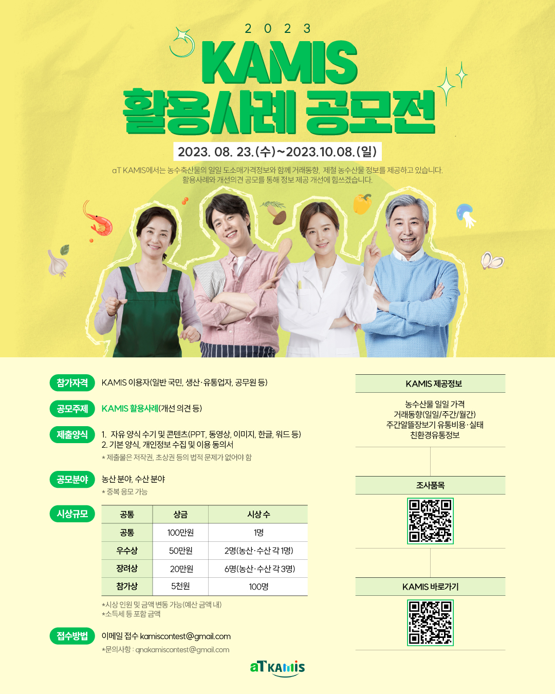 2023 KAMIS 활용사례 공모전 aT KAMIS에서는 농수축산물의 일일 가격정보와 함께 거래동향, 제철농수산물 정보 등을 제공하고 있습니다. 금번 2023년 KAMIS 활용사례 공모전을 통해 KAMIS 활용사례 수집을 통해 KAMIS를 홍보함과 동시에 서비스를 개선하는 기회를 갖고자 합니다. 많은 참여 부탁드립니다. ○ 참가자격 : KAMIS 이용자(일반 국민, 생산·유통업자, 공무원 등) ○ 공모주제 : KAMIS 활용사례(개선 의견 등) ○ 접수기간 : 2023년 08월 23일 수요일 \~ 2023년 10월 8일 일요일 ○ 제출양식 1. 자유 양식 수기 및 콘텐츠(PPT, 동영상, 이미지, 한글, 워드 등) 2. 기본 양식, 개인정보 수집 및 이용 동의서 * 제출물은 저작권, 초상권 등의 법적 문제가 없어야 함 ○ 공모분야 : 농산 분야, 수산 분야 * 중복 응모 가능 ○ 시상규모 - 공통 1명 : 상금 100만원 - 우수상 2명(농산·수산 각 1명) : 상금 50만원 - 장려상 6명(농산·수산 각 3명) : 상금 20만원 - 감사 사례품 : 5천원 상당 기프티콘 (100명 한도 지급) * 시상 인원 및 금액 변동 가능(예산 금액 내) * 소득세 등 포함 금액 ○ 접수방법 : 이메일 접수 kamiscontest@gmail.com ○ 문의사항 : qnakamiscontest@gmail.com ○ URL KAMIS 조사품목 페이지 https://www.kamis.or.kr/customer/price/knowhow/knowhow.do?action=itemList KAMIS 홈페이지 https://www.kamis.or.kr/customer/main/main.do ○ 유의사항 : 이벤트 진행 및 상품 발송을 위해 성함, 연락처를 수집합니다. * 개인정보 이외의 목적으로 사용되지 않으며, 상품 발송 후 1개월 이내 파기