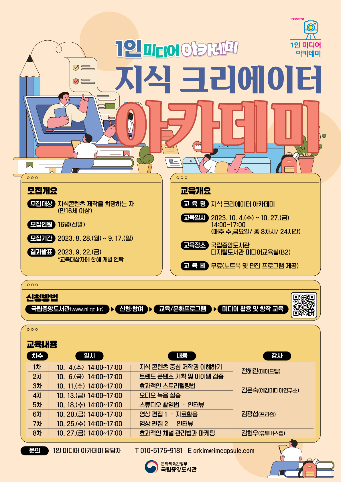 ■모집개요 - 모집대상: 지식콘텐츠 제작을 희망하는 자(만 16세 이상) - 모집기간: 2023. 8. 28.(월) \~ 9. 17.(일) - 모집정원: 16명(선발) - 결과발표: 2023. 9. 22.(금) *교육대상자에 한해 개별 연락