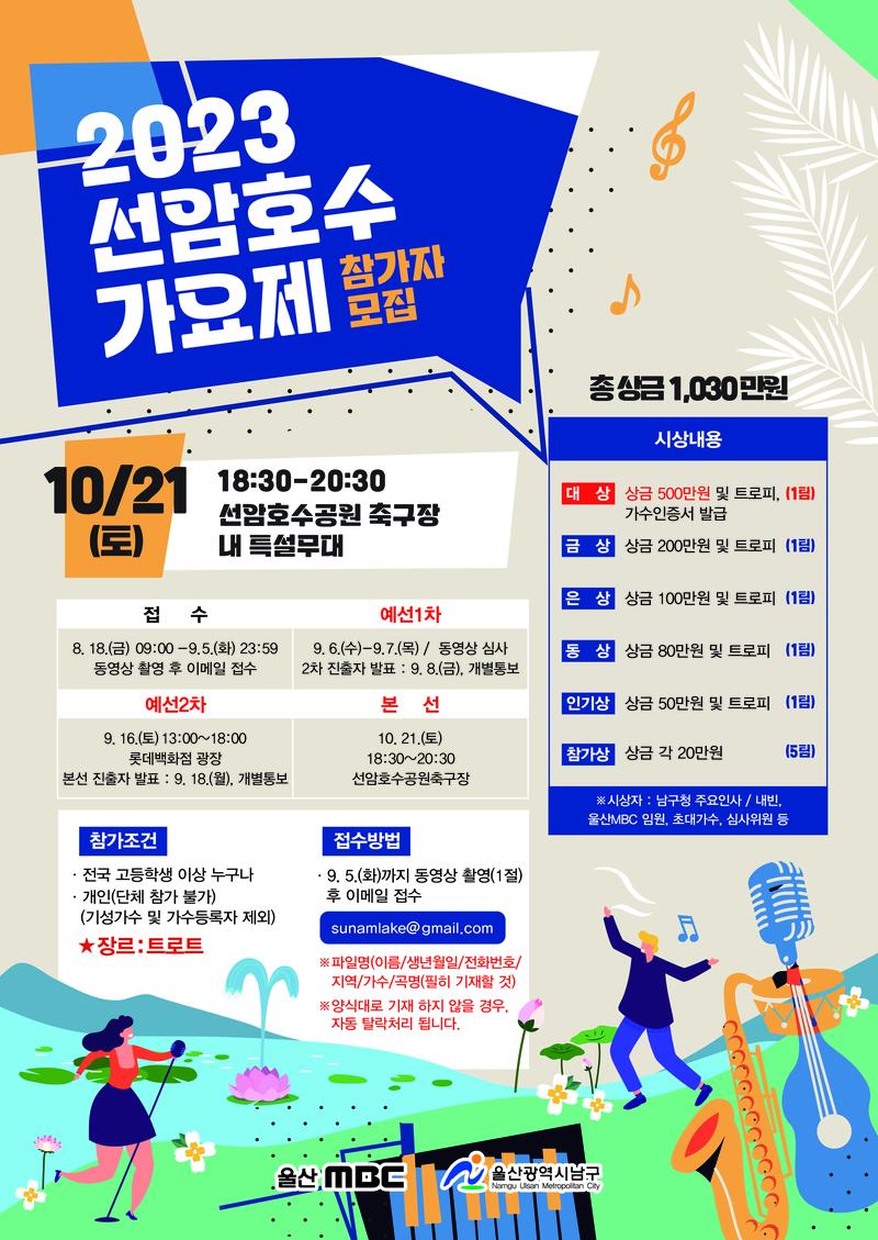 2023 선암호수 가요제 참가자 모집 안녕하십니까, 선암호수 가요제 운영본부입니다. 총 상금 1,030만원의 선암호수 가요제가 시작되었습니다. 많은 참여와 관심 부탁드리겠습니다. 접수 : 8. 18.(금) 09:00 - 9. 5.(화) 23:59 동영상 촬영 후 이메일(sunamlake@gmail.com)접수 ※파일명(이름/생년월일/전화번호/지역/가수/곡명 필히 기재할 것), 양식대로 기재 하지 않은 경우, 자동 탈락처리 됩니다. 장르 : 트로트 참가조건 : 전국 고등학생 이상 누구나, 개인(단체 참가 불가, 기상 가수 및 가수등록자 제외) ◆선암호수 가요제 일정 접수 : 8. 18.(금) 09:00 \~ 9. 5.(화) 23:59 예선1차 : 9. 6.(수) \~ 9. 7.(목) / 동영상 심사(비대면) 2차 진출자 발표 : 9. 8.(금), 개별통보 예선2차 : 9. 16.(토) 13:00 \~ 18:00 롯데백화점 광장(대면) 본선 진출자 발표 : 9. 18.(월), 개별통보 본선 : 10. 21.(토) 18:30 \~ 20:30 선암호수공원축구장 내 특설무대(대면) ◆본선 진출자 시상 대상 : 상금 500만원 및 트로피, 가수인증서 발급(1팀) 금상 : 상금 200만원 및 트로피(1팀) 은상 : 상금 100만원 및 트로피(1팀) 동상 : 상금 80만원 및 트로피(1팀) 인기상 : 상금 50만원 및 트로피(1팀) 참가상 : 상금 각 20만원(5팀)