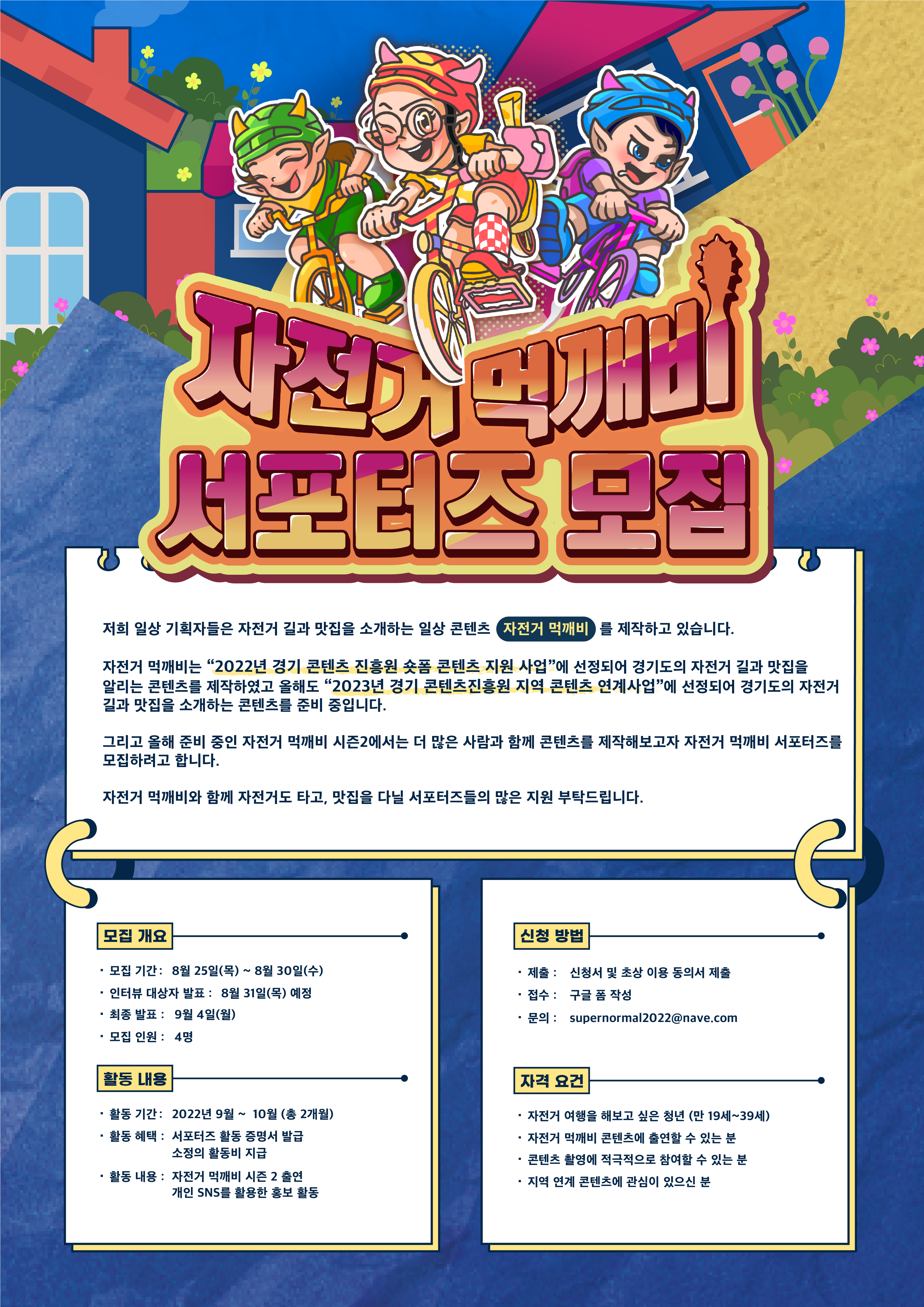 ○ 자전거 먹깨비 서포터즈 모집 저희 일상기획자들은 자전거 길과 맛집을 소개하는 일상 콘텐츠 <자전거 먹깨비>를 제작하고 있습니다. 자전거 먹깨비는 “2022년 경기콘텐츠진흥원 숏폼 콘텐츠 지원사업”에 선정되어 경기도의 자전거 길과 맛집을 알리는 콘텐츠를 제작했고, 올해도 “2023년 경기콘텐츠진흥원 지역 콘텐츠 연계사업”에 선정되어 경기도 자전거 길과 맛집을 소개하는 콘텐츠를 준비 중입니다. 그리고 올해 준비 중인 자전거 먹깨비 시즌2에서는 더 많은 사람과 함께 콘텐츠를 제작해보고자 자전거 먹깨비 서포터즈를 모집하려고 합니다. 자전거 먹깨비와 함께 자전거도 타고, 맛집을 다닐 서포터즈들의 많은 지원 부탁드립니다.