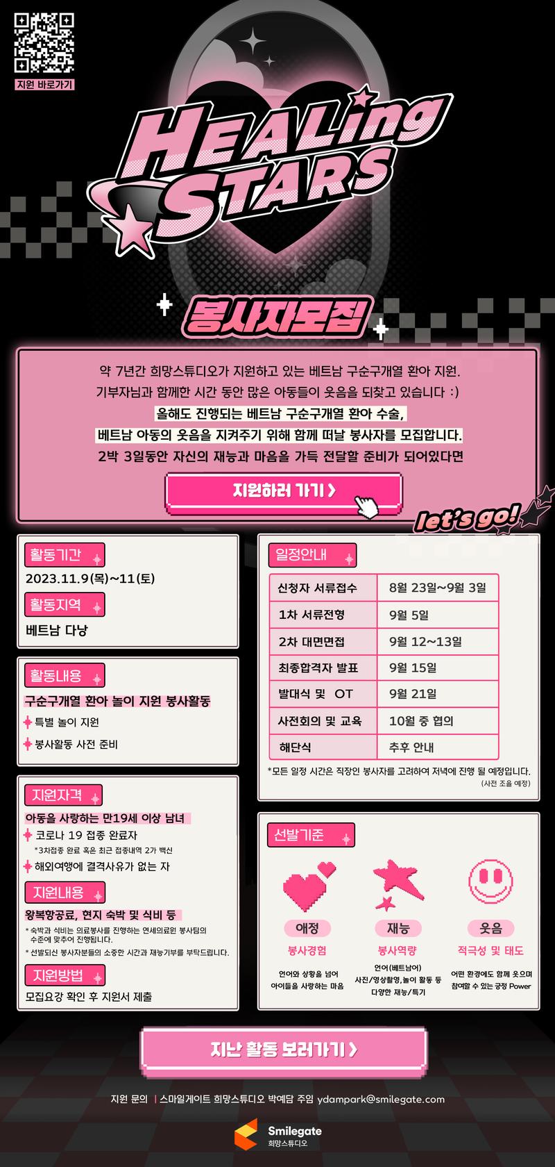 <봉사 혜택> 1. 왕복 항공료\, 현지 숙소 및 생활 지원 등 2. 스마일게이트 희망스튜디오 명의 인증서 수여 3. VMS 봉사활동시간 등록 (총 24시간) 4. 힐링스타즈 스페셜 선물 제공