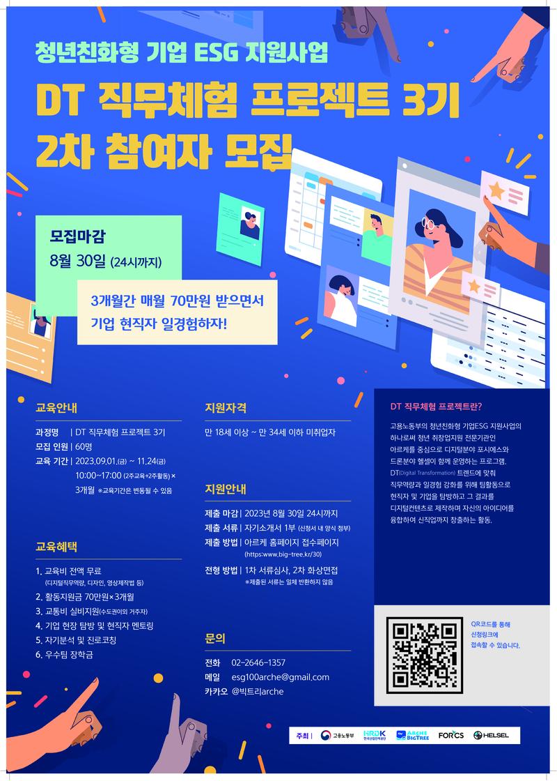 고용노동부 한국산업인력공단 주최로 실시하는 '2023 청년친화형 ESG 지원사업’ 빅트리 아르케가 "DT 직무체험 프로젝트" 3기를 모집합니다! ★DT 직무체험 프로젝트 3기★ 2022년에 이어, 2023년에는 커리어와 직무역량 향상을 꿈꾸는 청년들을 위해 더욱더 알차진 커리큘럼! 디지털 직무역량은 물론, 현직자 인터뷰와 개별 상담까지! 팀 활동을 통해 리더십도 키우고, 여러 현직자분들도 만나고 싶은 분들은 얼른 신청하세요! 프로젝트의 최종 목표인 창직활동까지 마치면 당신의 취업은 이미 준비 OK!! ✔포시에스 DT 역량 특강 ✔기업 현장 탐방 & ESG창직(신직업 개발) ✔월 70만원 활동지원금(3개월) & +a 교통비 지원(수도권 이외 거주자) ✔우수팀 장학금 지원까지! ✔1 대 1 개별 상담 & 코칭 👀 자세한 모집 내용 궁금하다면? 하단 링크 참조! https://blog.naver.com/bigtreearche/223180756039 ● 모집기간 : 08.12(토) \~ 08.30(수) ● 모집대상 : 만 18세 이상 \~ 만 34세 이하의 청년 미취업자 ● 모집인원 : 60명 ● 활동기간 : 09.01(금) \~ 11.24(금) - 2주 집체교육, 2주 팀활동 병행 ● 활동내용 - 디지털 직무역량 / 디지털 전환 역량교육 - 직업진로 교육 (심리 상담, 개인 코칭) - 현직자 및 기업 현장 탐방 & 창직(신직업 개발) - 부스트 캠프 진행 ● 신청서 작성 https://www.big-tree.kr/30 ● 문의처 전화 02-2646-1357 \| 메일 esg100arche@gmail.com \| 카카오 @빅트리arche 주최 \| 고용노동부, 한국산업인력공단 운영 \| ㈜아르케, ㈜포시에스, ㈜헬셀 아르케 블로그 : https://blog.naver.com/bigtreearche