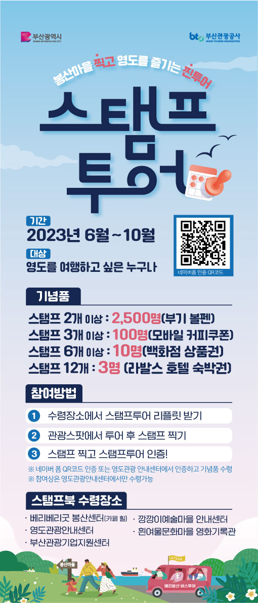 📅 스탬프 인증 기한 \~ 10. 31(화) 🎁 기념품 매월 말 추첨을 통한 기념품 제공 ① 스탬프 12개 - 5만원 상당 백화점 상품권 (3명) ② 스탬프 6개 - 3만원 상당 백화점 상품권 (5명) ③ 스탬프 3개 - 5천원 상당 커피 쿠폰 (10명) ④ 스탬프 2개 - 부기볼펜 (2,000명) (※ 영도관광안내센터 내 선착순 지급)