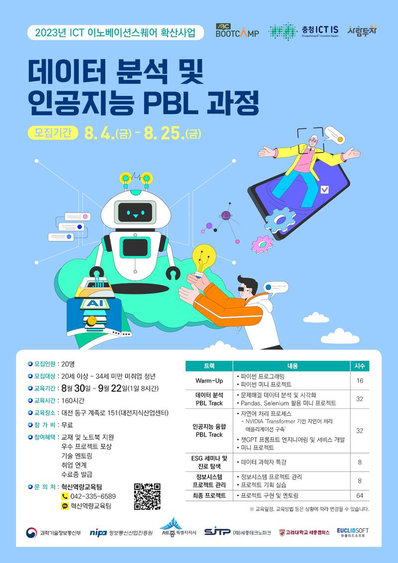 💙 {데이터 분석 및 인공지능 프로젝트 기반 과정} 참여자 모집 💙 📚 기술 교육 외에도 ESG 세미나 및 진로 탐색, 정보 시스템 프로젝트 관리를 알아갈 수 있는 과정입니다! 😉