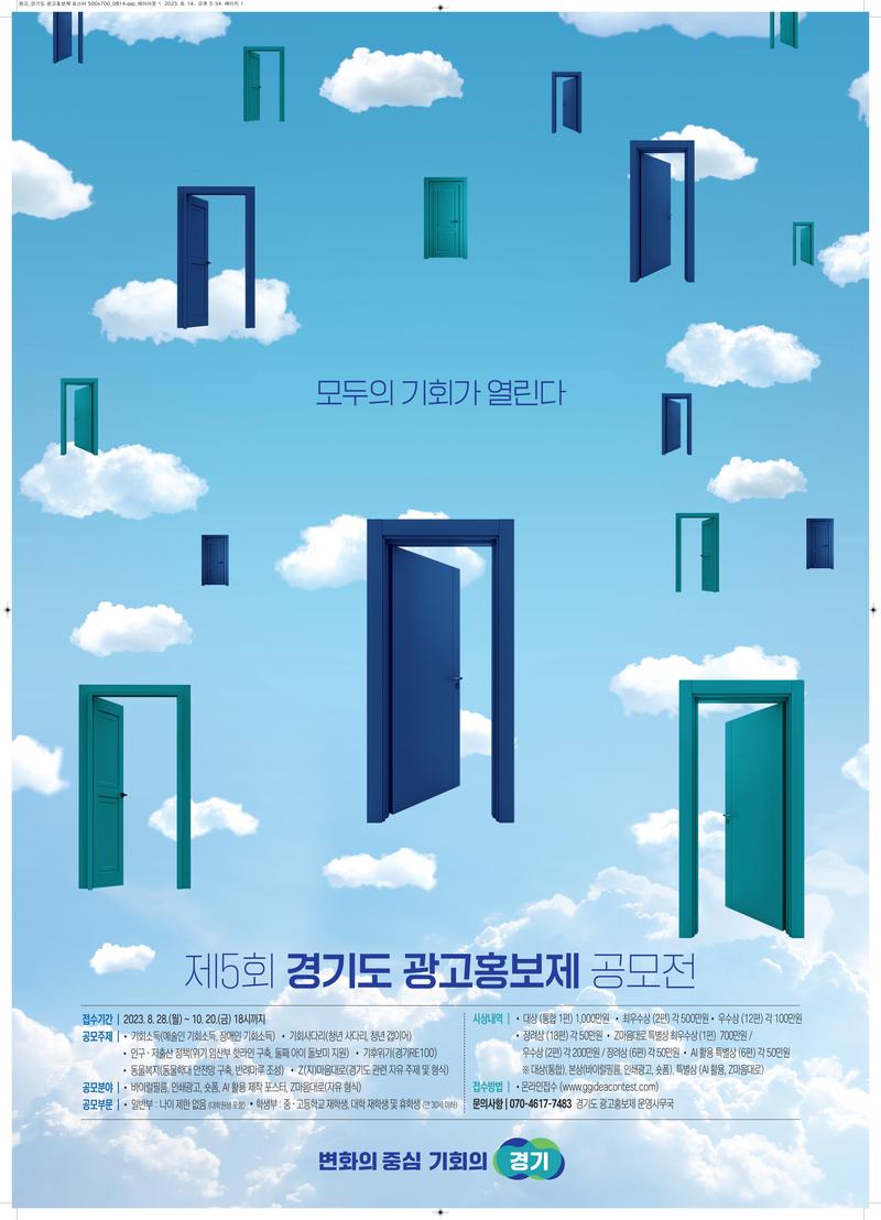 □ 주최/주관 : 경기도 □ 공모주제 : 6개 주제 중 자유 선택 • 1. 기회소득 분야 (예술인 기회소득, 장애인 기회소득) • 2. 청년정책 분야 (청년 사다리, 청년 갭이어) • 3. 동물복지 분야 (동물학대 안전망 구축, 반려마루 조성) • 4. 인구 및 저출산 관련 정책 분야 (위기 임산부 핫라인 구축, 둘째 아이 돌보미 지원) • 5. 기후위기 (경기 RE100) • 6. Z(지)마음대로 (경기도 관련 자유주제 및 형식 광고) □ 공모부문(응모자격) - 2개 부문 • 공모부문 : 2개 부문(일반부, 학생부) • - 일반부 : 나이 제한 없음 • - 학생부 : 중·고등학교 재학생, 대학 재학생 및 휴학생 • ※ 대학원생은 일반부 (단, 학생부는 만 30세 이하만 지원 가능함) • 참가단위 : 개인 또는 최대 3인의 팀(제출 후에 팀원 교체 불가) • ※ 공모부문 혼재된 팀 구성의 경우 상위 그룹으로 응모 • 참가자격 : 국내외 거주 국민 누구나 참가 가능(단, 한글 작품) □ 공모분야 : 본상 및 특별상 분야 (총 5개 분야) • 본상 • -바이럴 필름: 2분 이내 영상 • -인쇄광고: 신문잡지ㆍ옥외용 매체 광고물 • -숏폼: 60초 이내 영상 • Z마음대로 특별상 • -Z마음대로: 학생부 특별상으로, 지원팀의 자유로운 광고형태로 제안 가능 e.g.) 벽화,웹툰, 로고송 등 형식 제한 없이 자유롭게 지원 가능 • AI특별상 • -AI 활용: (오픈) AI 엔진을 활용하여 제작한 홍보 포스터 □ 접수방법 • 접수 기간 : 2023. 08. 28.(월) 10:00 \~ 10. 20.(금) 18:00까지 • 접수방법 : 온라인접수 (www.ggideacontest.com) ※ 오프라인 제출 불가 • 제 출 물 • - 온라인 접수 • 1) 신청서 (홈페이지 접수 페이지 작성) • 2) 서약서, 개인정보수집 · 이용동의서, 수상작품 사후활용 동의서 • (홈페이지 회원가입 및 작품 접수 시 필수 동의) • 응모 작품 결과물 • ※ 바이럴필름/숏폼 : 영상을 업로드한 유튜브 URL을 참가신청서에 입력, 나머지 분야는 온라인 접수 시 파일로 첨부 ※ 마감 시간이 임박하면 접속 부하로 시스템에 장애가 생길 수 있으니, 여유 있게 출품 하시기 바랍니다. □ 수상발표 및 시상 • 수상팀 발표 : 홈페이지 공지(11월 중) 및 수상팀 대표에게 개별 통보 • 시상식 및 전시 : 2023. 12월 초(예정) • 시상금 지급 : 수상작 발표 후 60일 이내 • ※ 시상 및 기타 행사는 상황에 따라 변경될 수 있으며, 변경 될 경우 홈페이지를 통해 사전 공지 예정 • ※ 시상금은 수상팀의 필요서류 제출 및 확인 이후 지급 예정 • 시상금 : 48작품/5,800만원 □ 문의처 : 경기도 광고홍보제 공모전 운영사무국 / 연락처 : 070-4617-7483 / 2023ggic@gmail.com / 홈페이지 Q&A 게시판 (http://www.ggideacontest.com)