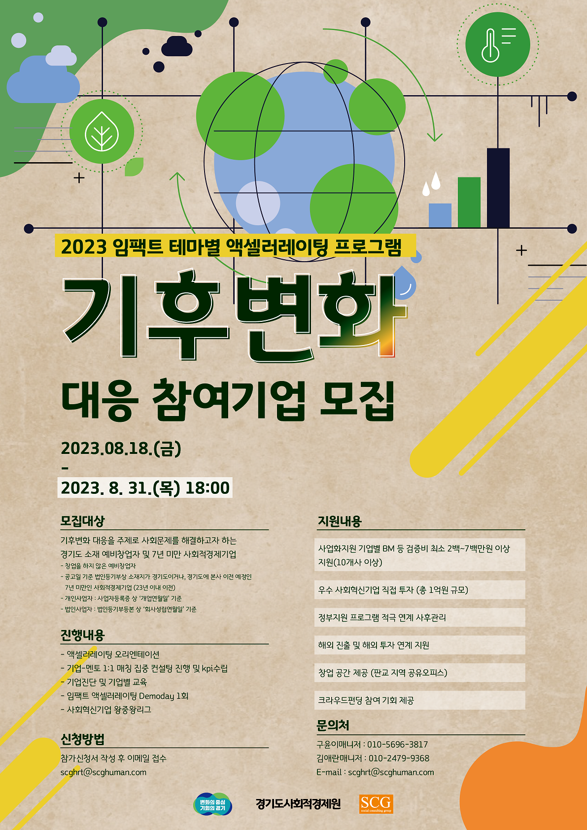 ✅공모문✅ 「2023년 임팩트 테마별 액셀러레이팅 프로그램 (기후변화대응) 」은 경기도사회적경제원과 (주)에스씨지가 기후변화대응을 주제로 한 사회혁신기업 성장을 위해 지원하는 프로그램입니다. 기업 BM분석을 통한 수요 맞춤형 교육 프로그램, 데모데이를 통한 투자자 연계 및 시장진출 성과 지원 등 맞춤형 액셀러레이팅 프로그램을 통해 성장할 경기도 소재 예비창업자 및 7년 미만 사회적경제기업의 많은 관심과 참여 부탁드립니다. 2023년 8월 18일 경기도사회적경제원