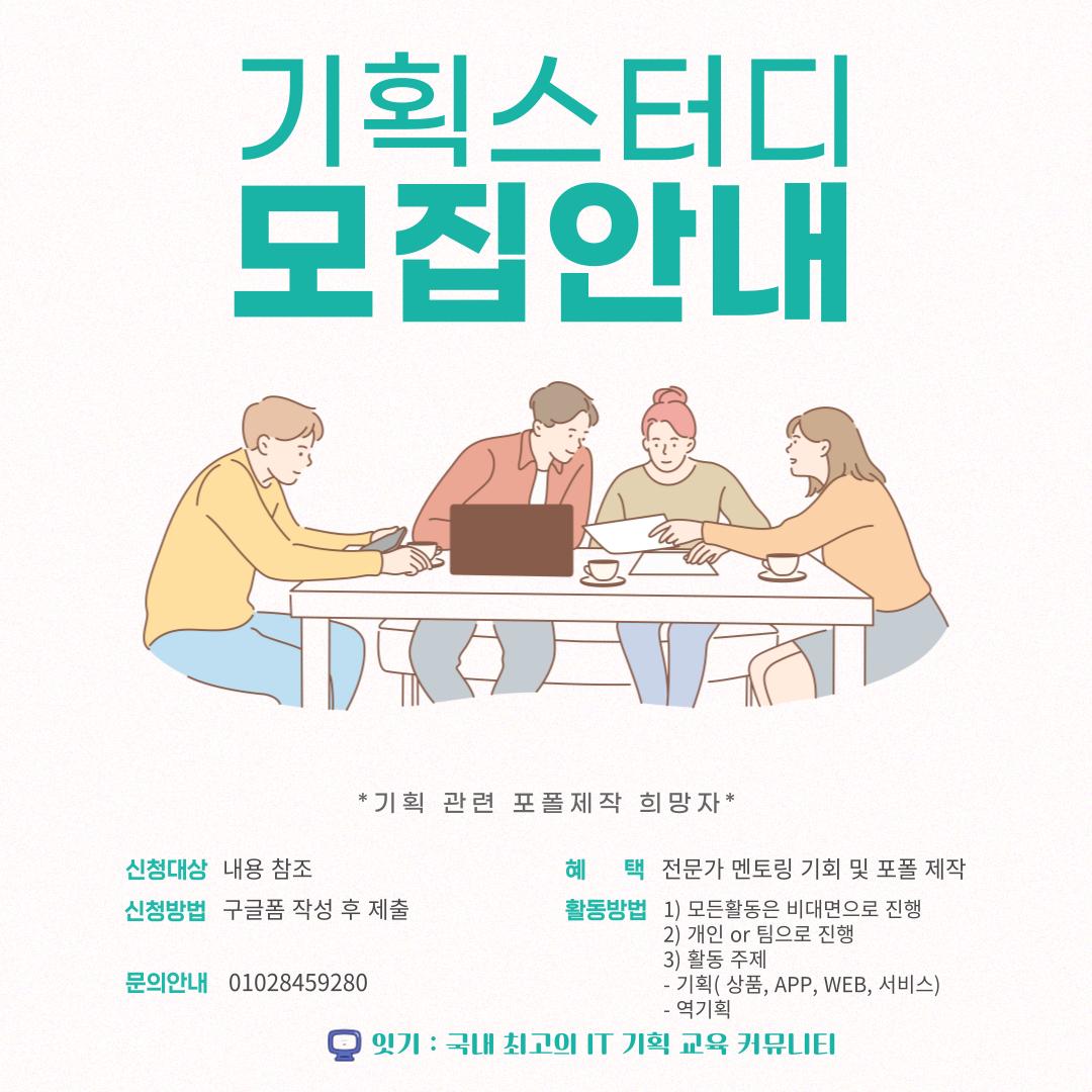 ● 이런 분이 들으시면 좋아요! 1) 기획직무로 진로를 꿈꾸는 분 2) 기획직무에서 일을 하지만 자기발전이 필요한 분 3) 프로젝트 또는 창업을 꿈꾸는 분 4) 고등학생, 대학생, 직장인, 일반인 모두 진행할 수 있습니다. ● 참여정보 모집기간 : 08.31까지 신청받습니다. ▶ 상세히 보기 : https://vo.la/w6nA2 1) 잇기 소개 : https://www.itgicreator.com/ 2) 카톡 : https://open.kakao.com/me/Creatorsong