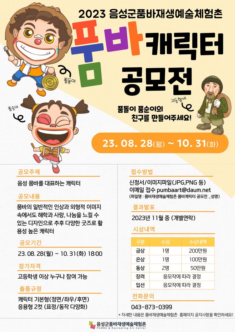공모분야 음성 품바를 대표하는 캐릭터 공모내용 품바의 일반적인 인상과 외형적 이미지 속에서도 해학과 사랑, 나눔을 느낄 수 있는 디자인으로 추후 다양한 굿즈로 활용성 높은 캐릭터. (※ 음성군품바재생예술체험촌은 음성군의 대표축제인 음성품바축제의 사랑과 나눔 정신을 바탕으로 하고 있습니다. 품바정신에 근거하면서 쓸모없다고 버려진 것에도 새로운 가치를 부여하고 예술로 승화시키는 창작 공간이며 사랑과 나눔의 품바 정신을 아우르고 교감하는 곳입니다.) 공모기간 : 2023. 08. 28. (월) \~ 10. 31. (화) 18:00 참가자격 : 고등학생 이상 누구나 참여 가능 출품규정 - 캐릭터 기본형(정면/좌·우/후면) - 응용형 2컷 이상(표정/동작 다양화) 제출서류 - 참가 신청서 1부 (서식1) - 캐릭터 이미지 파일 (JPG,PNG,등) 접수방법 음성군품바재생예술체험촌 이메일(pumbaart@daum.net) (※파일명 : 품바재생예술체험촌 품바캐릭터 공모전_성명) 운영일정 - 심사발표 : 2023. 11월 중 발표 (시상 일정 추후 개별통보) - 시상일정 : 차후 개별통보 예정 - 공모전 전시 : 시상식 후 전시 예정 시상내용