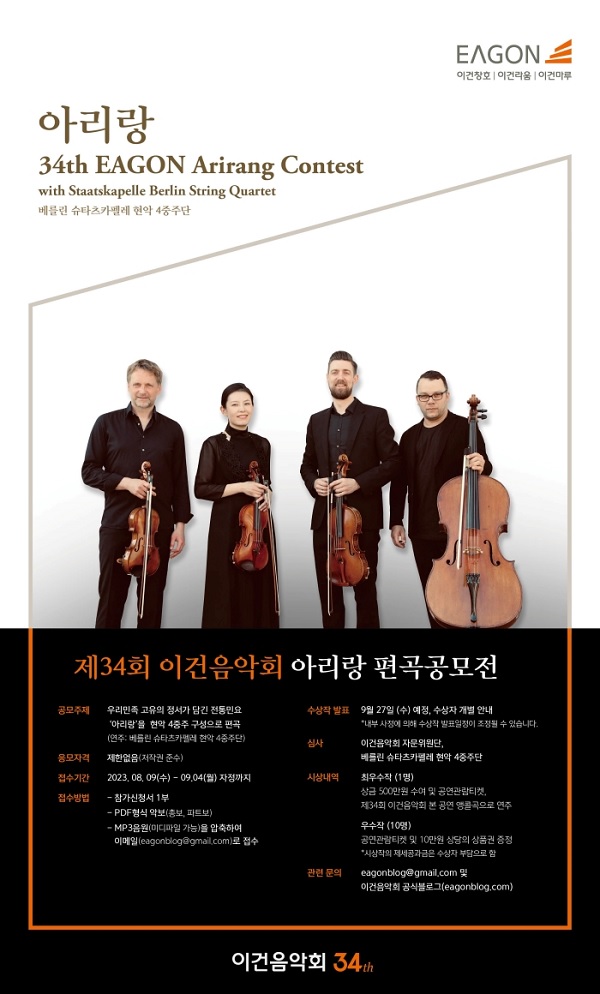 ◈34회 이건음악회 아리랑 편곡 공모전 2012년부터 시작한 이건음악회의 ‘아리랑 편곡 공모전’은 초청된 연주자에게 ‘아리랑’을 연주하게 함으로써 단 순 내한공연이 아닌 우리 민족 고유의 정서를 느낄 수 있는 기회를 제공하는데 목적이 있습니다. 또한 아리랑 편곡 공모전을 통해 국내 숨겨진 전도 유망한 음악가를 발굴하여 세계적인 연주자들에게 곡을 선물하고 함께 연주회에 참 여할 수 있는 기회를 제공하여 음악가로서 한단계 더 성장할 수 있는 기회도 제공하고 있습니다. 마지막으로 당선작 을 공연장에서 접하는 관객들에게도 우리에게 익숙한 전통음악이 멋지게 편곡되어 세계적인 연주자의 연주로 접할 수 있는 감동을 선사하고 있습니다. 해마다 이건음악회에서는 우리 민족 고유의 음악인 아리랑을 편곡하는 공모전을 진행합니다. 전통적인 아리랑이 전 도 유망한 작곡가들의 번뜩이는 영감으로 멋지게 탈바꿈되는 과정을 지켜보는 것도 굉장히 재미있습니다. ◈참가 자격 학생, 일반인을 포함한 개인/팀 누구나 응모 가능 ◈접수 기간 2023. 08. 09(수) – 09. 04(월) 자정까지 ◈공모 주제 우리민족 고유의 정서가 담긴 전통민요 ‘아리랑’을 베를린 슈타츠카펠레 현악 4중주가 연주할 수 있도록 편곡(바 이올린 2, 비올라1, 첼로1) ◈접수 방법 참가신청서 1부, PDF 형식의 악보(총보, 파트보) / MP3 음원 (미디파일 가능)을 파일로 압축하여 이메일 접수 ◈접수처 eagonblog@gmail.com ( ms word 양식으로 제출) ◈심사 이건음악회 자문위원 및 베를린 슈타츠카펠레 현악 4중주단 ◈시상 내역 최우수상 (1명) : 상금 500만원 수여 및 34회 이건음악회 본공연 앵콜곡 연주 / 우수작 (10명) : 스타벅스 상품권 10만원권 (*제세공과금 별도) ◈기타 문의 eagonblog@gmail.com 및 이건음악회 블로그 댓글