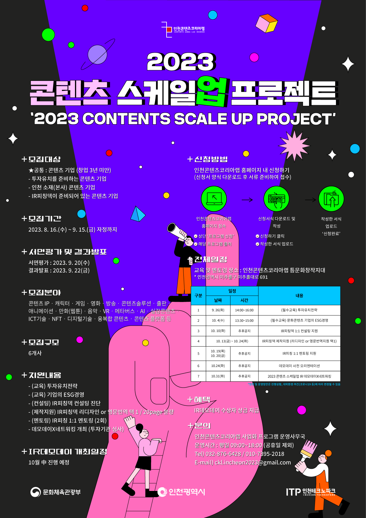 < 모집개요 > ▶ 모집기간 : 2023. 8. 16(수) \~ 9. 15(금) 자정까지 ▶ 모집대상 ★공통 : 콘텐츠 기업 (창업 3년 미만) - 투자유치를 준비하는 콘텐츠 기업 - 인천 소재(본사) 콘텐츠 기업 (외 지역도 가능) - IR피칭덱이 준비되어 있는 콘텐츠 기업 ▶ 모집규모 : 6개사 ▶ 모집분야 콘텐츠 IP 캐릭터·게임·영화·방송·콘텐츠솔루션·출판·애니메이션·만화(웹툰)·음악·VR·메타버스·AI·실감콘텐츠·ICT기술·NFT·디지털기술·융복합 콘텐츠·콘텐츠 플랫폼 등 ▶ 서면평가 및 결과발표 - 서면평가 : 2023. 9. 20(수) - 결과발표 : 2023. 9. 22(금) ▶ 신청하기 : 인천콘텐츠코리아랩 홈페이지 내 프로그램 신청 > '[2023 콘텐츠 스케일업 프로젝트] 콘텐츠기업 모집공고' 클릭 > 신청서식 다운로드 및 작성 > 업로드 하면 '신청완료'