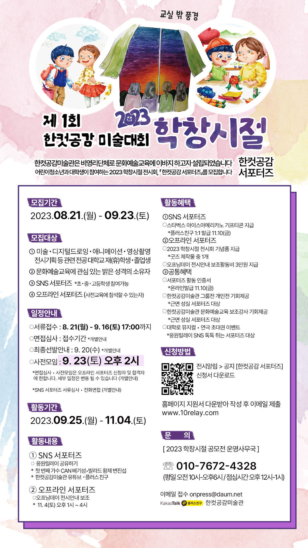 ○ 모집개요 - 2023 학창시절 전시회 한컷공감 서포터즈 많은 관심과 참여를 부탁드립니다 ○ 기간 및 일정 - 접수일자 : 08.21.(월)\~09.16(토) 17:00까지 - 면접심사 : 접수기간 중 개별연락 ( 한컷공감 서포터즈 신청서 참조 ) - 사전모임 : 09.23(토) 오후 2시\~오후5시 * 오프라인 서포터즈 신청자만 해당 - 장소 : 한컷공감미술관 본관(경기 동두천시 지행동 405-65) - 활동기간 : 09.25(월)\~11.04(토) ○ 지원자격 - SNS 서포터즈 : 초\,중\,고등학생 - 오프라인 서포터즈 : 대학생(휴)\, 졸업생 ○ 모집인원 - 25명 ○ 활동내용 - SNS 서포터즈 : 응원릴레이 공유하기 * 첫 번째 가수 CAN 배기성 [ 바로가기 ] * 발라드 왕자 변진섭 [ 바로가기 ] - 오프라인 서포터즈 : 2023 학창시절 전시회 전시안내 보조 *오프닝데이 11.04(토) 오후 2시 ○ 접수방법 - 홈 페이지 전시알림> 공지[한컷공감 서포터즈] 신청서 다운로드 지원 [ 바로가기 ] - 메일접수 ( onpress@daum.net ) ○ 혜택내역 - SNS 서포터즈 * 스타벅스 아이스아메리카노 기프티콘 지급 ( 플러스친구 1:1 발급 11.10(금) ) - 오프라인 서포터즈 * 2023 학창시절 전시회 기념품 지급 ( 굿즈 제작물 중 1개 ) * 오프닝데이 전시안내 보조활동비 3만원 지급 - 공통혜택 * 서포터즈 활동 인증서 *온라인 발급 11.10(금) * 한컷공감미술관 그룹전, 개인전 기회제공 ( 근면 성실 서포터즈 대상 ) * 한컷공감미술관 문화예술교육 보조강사 기회제공 ( 근면 성실 서포터즈 대상 ) * 대학로 뮤지컬, 연극 초대권 이벤트 ( SNS 톡톡 취는 서포터즈 대상 ) ○ 유의사항 - 면접심사\, 서포터즈 발표는 모집기간 중 개별연락을 신청인 연락처 문자로 합니다. * 문자 수신 후 2일 이내 참여 여부를 플러스친구 1:1 로 회신하여 주셔야 합니다. ( 미회신 자동취소 ) ○ 문의 [ 2023 학창시절 전시회 운영사무국 ] - ☏ 010-7672-4328 - 메일문의 : onpress@daum.net - 플러스친구 한컷공감미술관 [ 바로가기 ]