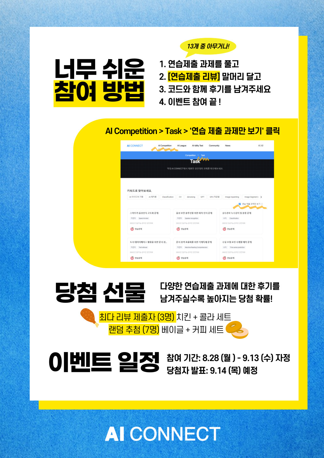 ✅AI CONNECT에서 풀 수 있는 13개의 연습제출 문제 중 마음에 드는 문제를 골라, 과제를 풀고 코드리뷰를 남겨주세요!
