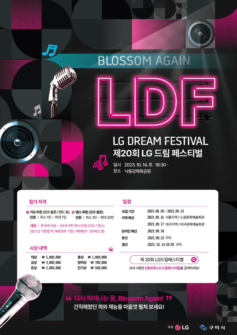 LG드림페스티벌은 2000년에 제 1회를 시작으로 많은 스타를 발굴했던 청소년 문화 축제입니다. 지난 펜데믹 이 후 3년간의 공백을 깨고 지역 청소년들에게 잠재 되어있던 끼와 재능을 펼칠 [Blossom again 제20회 LG 드림페스티벌]을 개최합니다.