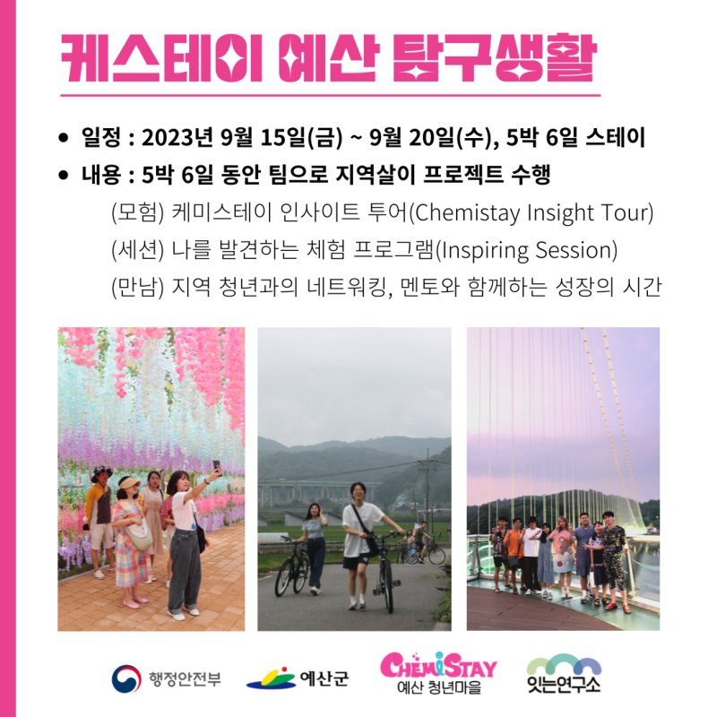 예산 탐구생활은 5박 6일 동안 예산의 매력을 발굴하고 나의 가능성을 탐구하고, 이를 바탕으로 예산에서 내가 할 수 있는 일을 디자인하며 나다움을 찾아가는 프로그램입니다.