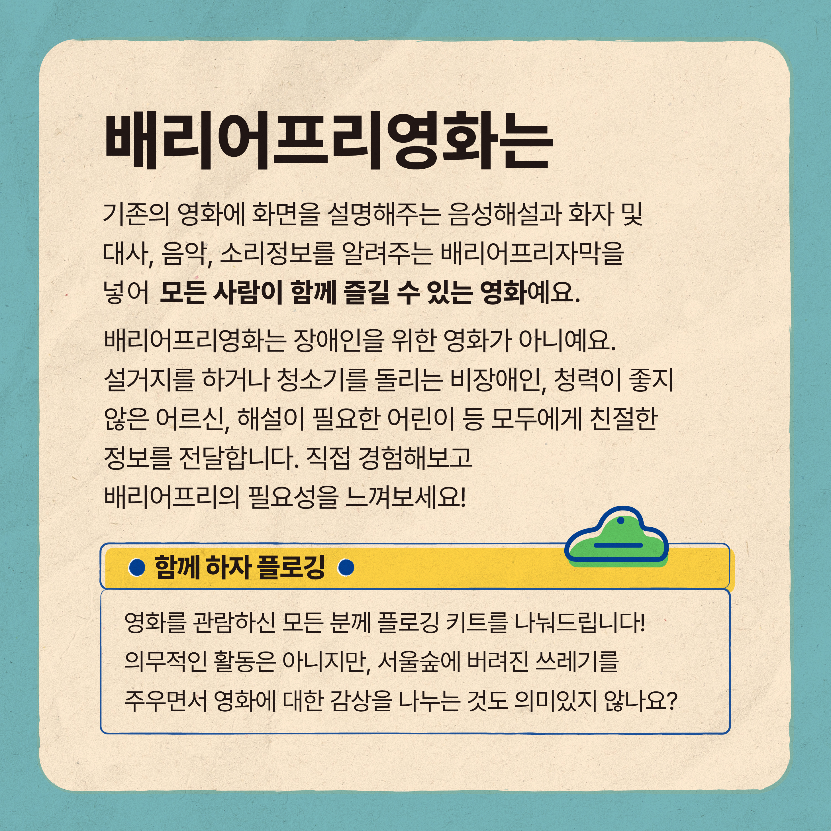 배리어프리영화는 장애인을 위해 만들어진 영화일까요? 설거지를 하거나 청소기를 돌리느라 영화를 집중해서 보기 어려운 상황에서, 청력이 좋지 않은 어르신이 혼자 영화를 볼 때, 영화 내용에 대한 지도가 필요한 어린이와 함께 영화를 볼 때도 유용해요. 장애인과 비장애인 모두를 위한 영화랍니다. 이번 상영회를 통해 배리어프리영화를 직접 경험해보고 그 필요성에 대해 다같이 생각해봅시다!