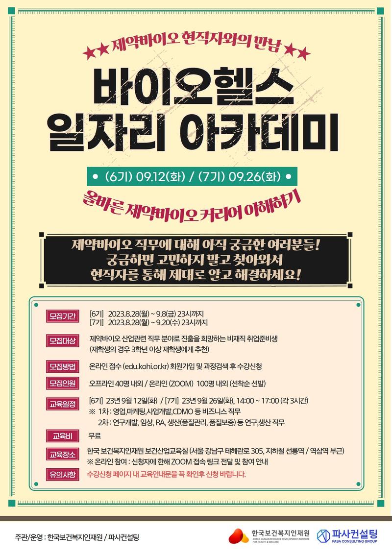 바이오헬스산업 제약바이오 분야에 대해 직무를 이해하고, 전문인력 양성 및 유입을 위한 ✨7기 바이오헬스산업 일자리 아카데미✨를 진행하오니 많은 참여 부탁드립니다.