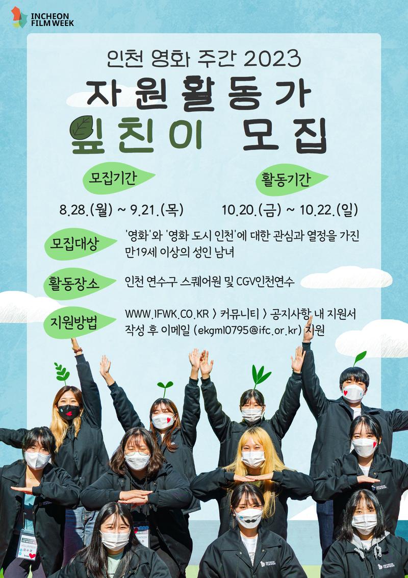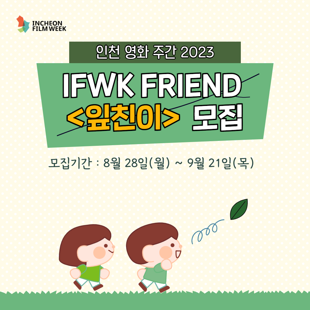 오는 10월, 인천 연수구 스퀘어원 및 CGV인천연수와 인천 광역시 일대에서 개최되는 인천 영화 주간 2023 자원활동가 <잎친이>를 모집합니다. 즐거움과 새로운 가능성이 넘치는 의미 있는 영화 축제 인천 영화 주간 2023의 잎이 되어줄 여러분의 참여를 기다립니다.