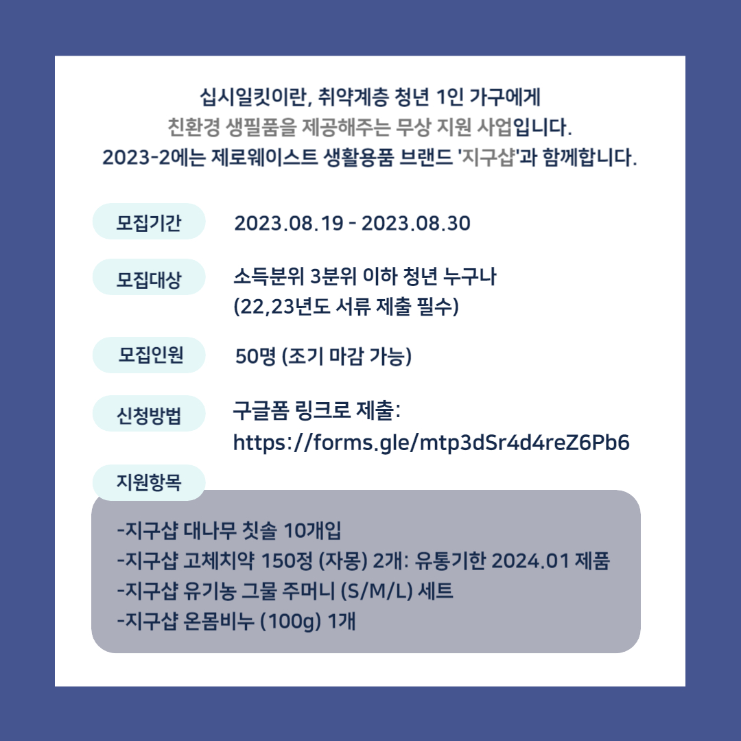 사회적 / 친환경 기업과 함께 무상으로! 생필품 키트를 배송해주는 프로젝트입니다.2023년 하반기에는 제로웨이스트 생활용품 편집 브랜드 지구샵과 함께합니다.