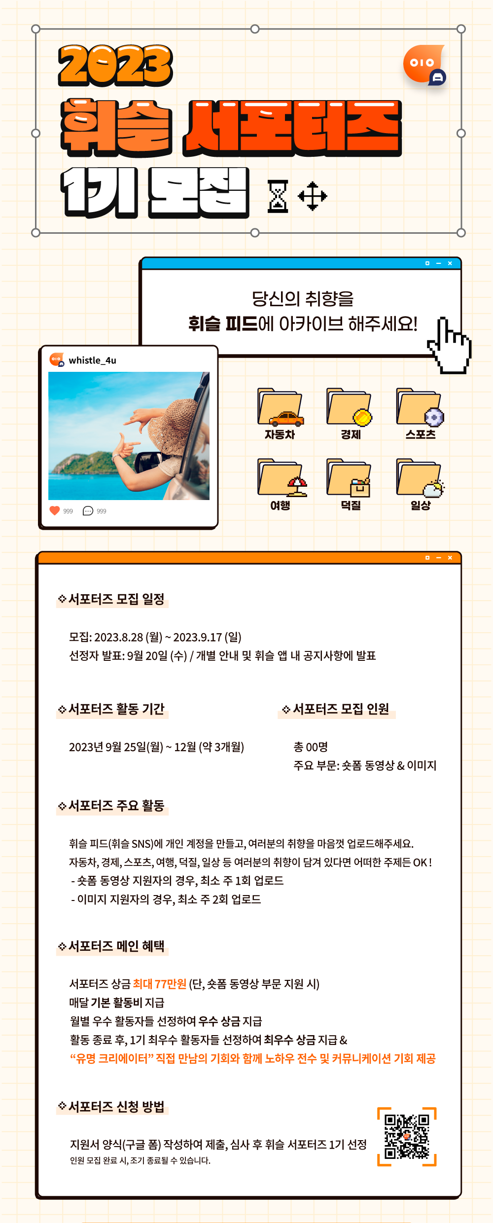 휘슬이 새롭게 선보이는 '휘슬 피드' 에서 활발한 활동을 펼쳐주실 휘슬 서포터즈 1기를 모집합니다 !