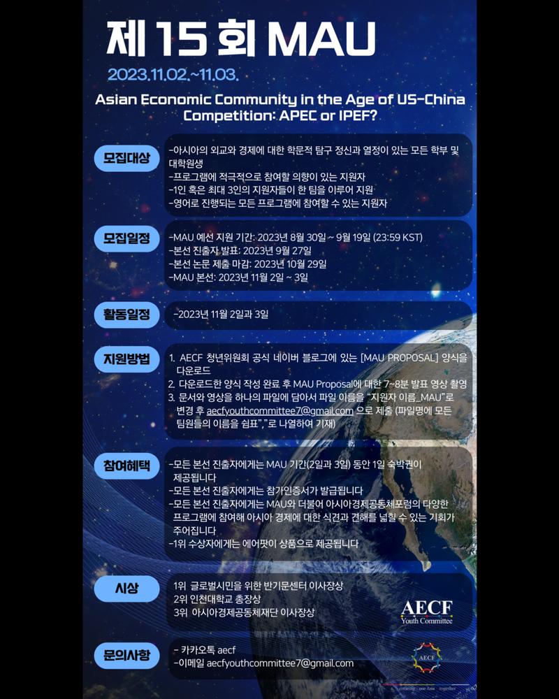 ● MAU(Model Asian Union)은 아시아경제공동체재단에서 매년 11월에 주최하는 국제적인 학술 컨퍼런스입니다.