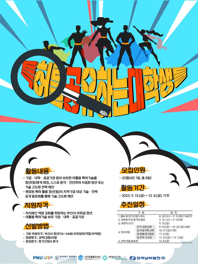 - 본 활동은 부산대학교 LINC 3.0, 동아대학교 창업지원단, ㈜마중물리서치, 리녹스㈜, 한국남부발전㈜ 등 5개 기관이 함께합니다.