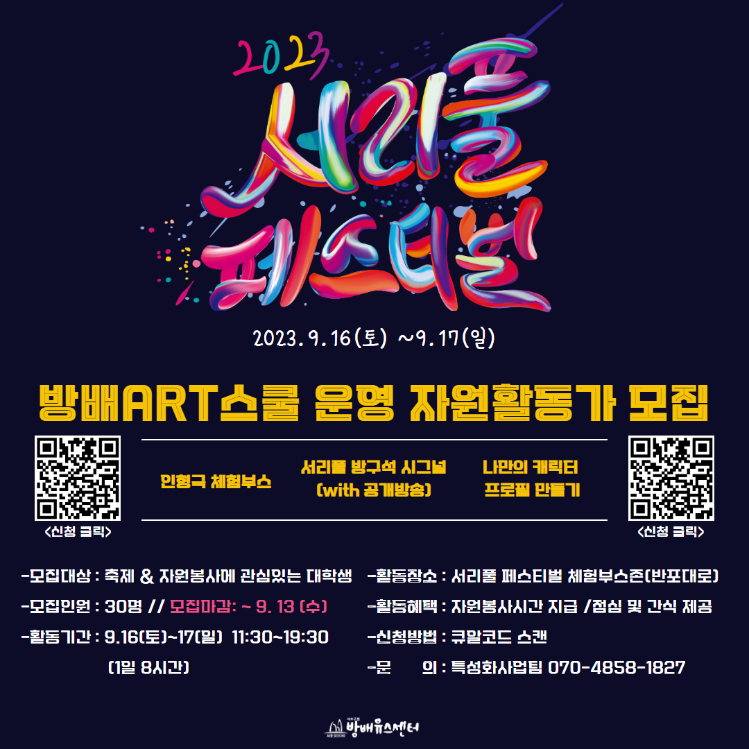 '서리풀 페스티벌' 체험부스Zone에서 방배유스센터가 운영하는 [방배ART스쿨]에 여러분을 초대합니다!!