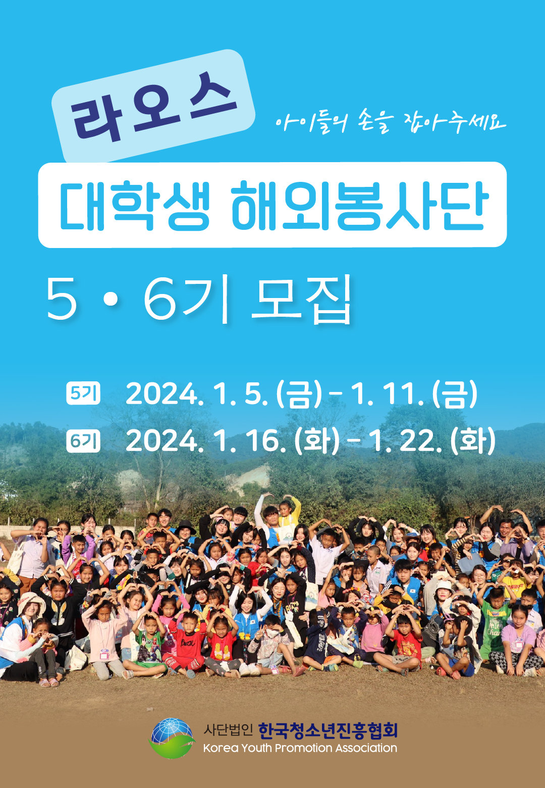 한국청소년진흥협회 KYPA에서 라오스 아이들에게 교육봉사를 통해 희망을 나누고, 후원물품을 전달하러 2024년 1월 라오스로 해외봉사를 떠날 대학생 자원봉사자를 모집합니다!