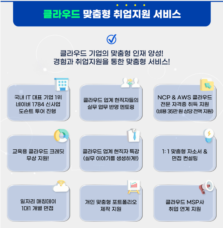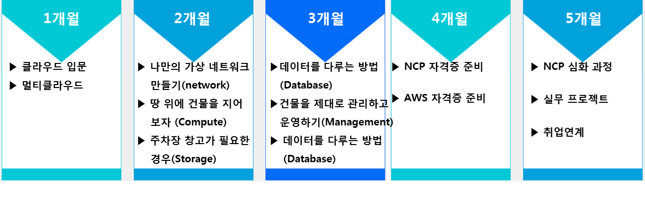 ☞ 총 5개월 과정의 전문교육으로 클라우드의 기초부터 실무까지 진행되며, 자격증 취득과 MSP사 취업