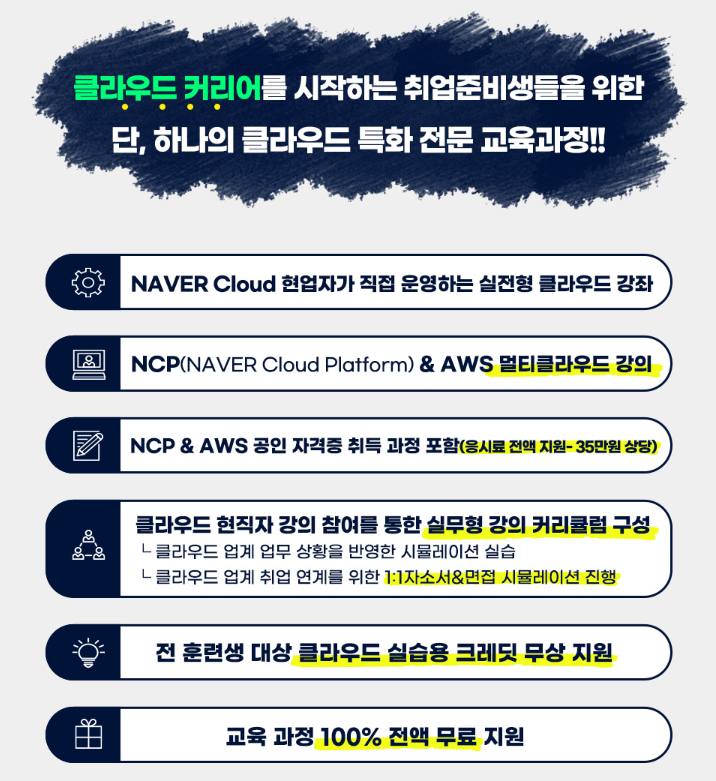 - 클라우드 자격증 ( NCP , AWS ) 취득을 원하시는 분들 ( 취득비 100% 지원 및 자격증 1타강사 강의 )