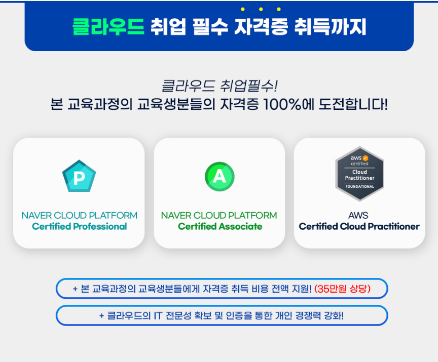 - NAVER Cloud & AWS 공인자격증 3개 응시료 제공