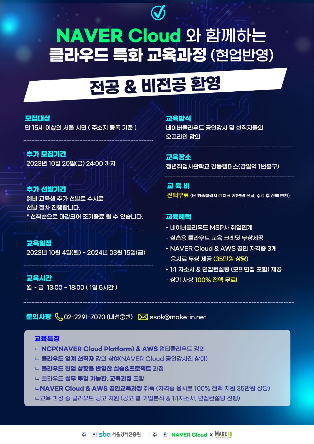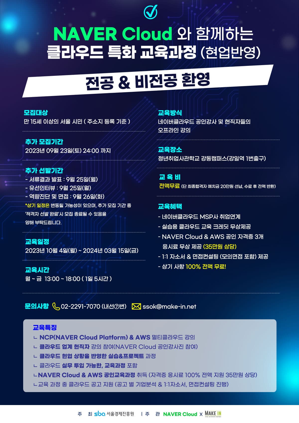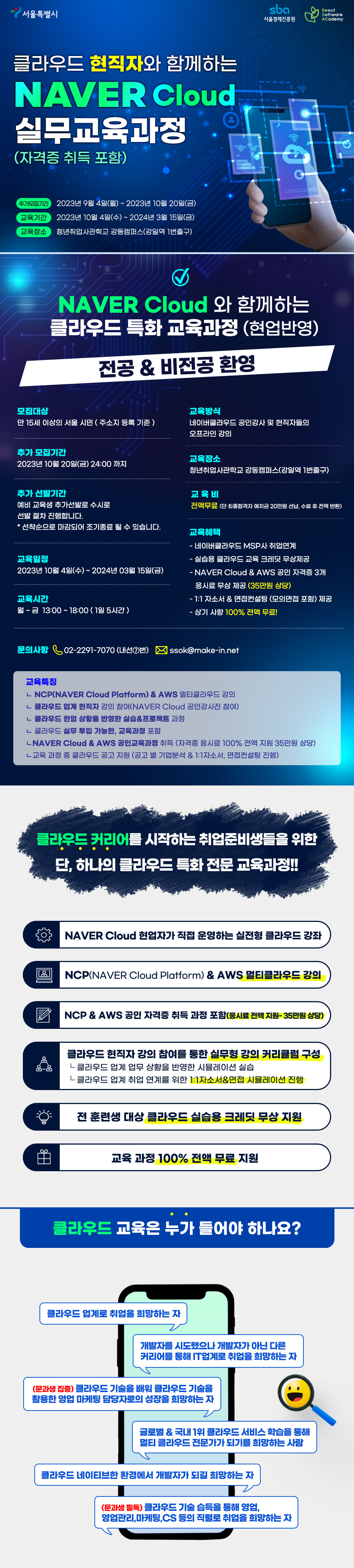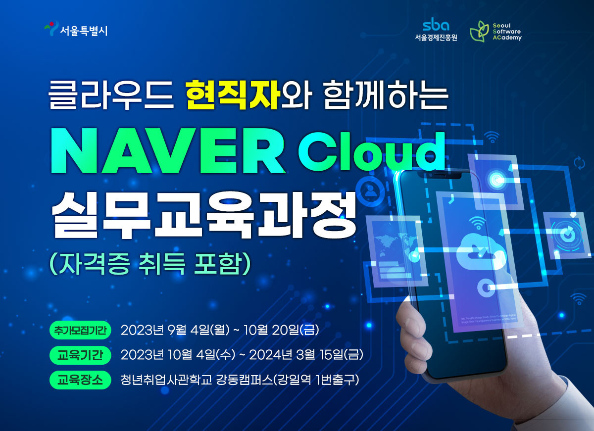 ★ 본 교육은 네이버클라우드(주)와 서울시, 서울경제진흥원(SBA)과 함께 클라우드 분야의 취업을 희망하는 구직자분들을 대상으로 추진하는 100% 무료 교육 입니다.
