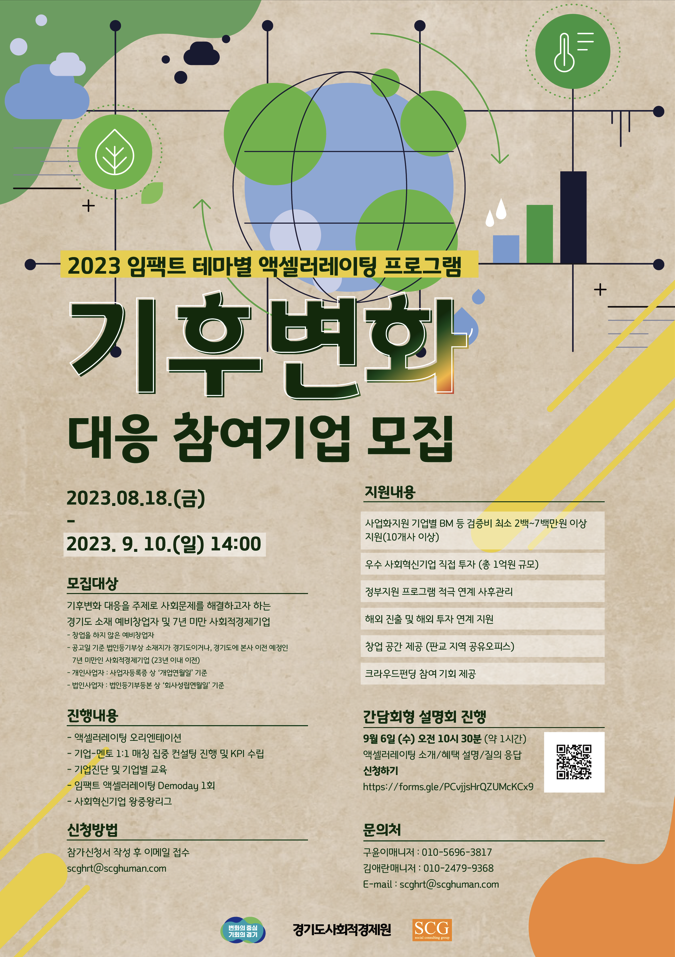 사회적경제기업을 대한민국 No.1 엑셀러레이터사인 SCG KOREA와 함께 발굴 및 육성합니다. 기후변화 대응 관련 사회적경제기업에게 새로운 기회가 될 것입니다. * 9월6일(수) 설명회에도 많은 참석부탁드립니다.
