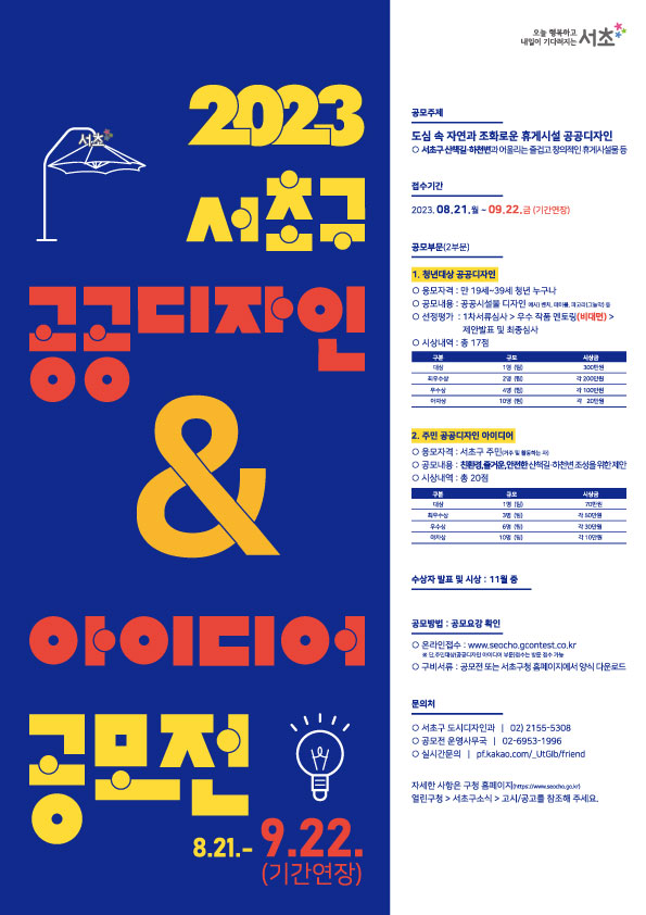 ◈ 공모개요 「2023 서초구 공공디자인 공모전 & 아이디어 공모전」 우리구는 창의적인 아이디어를 발굴하고 새롭고 다양한 디자인을 적용하여 생활 속 즐거움과 활기찬 도시환경을 조성하고자 전국의 청년과 관내 주민을 대상으로 「2023 서초구 공공디자인 & 아이디어 공모전」을 실시하오니 많은 분들의 참여바랍니다.